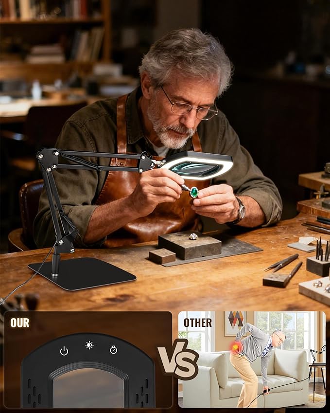 • Stable Heavy-Duty Base: Featuring a wide rectangular base that is non-slip and securely supports the magnifying lamp without falling. The flexible swing arm enables easy multi-angle adjustments, providing precise positioning for ultimate immersion in sewing, painting, or modeling