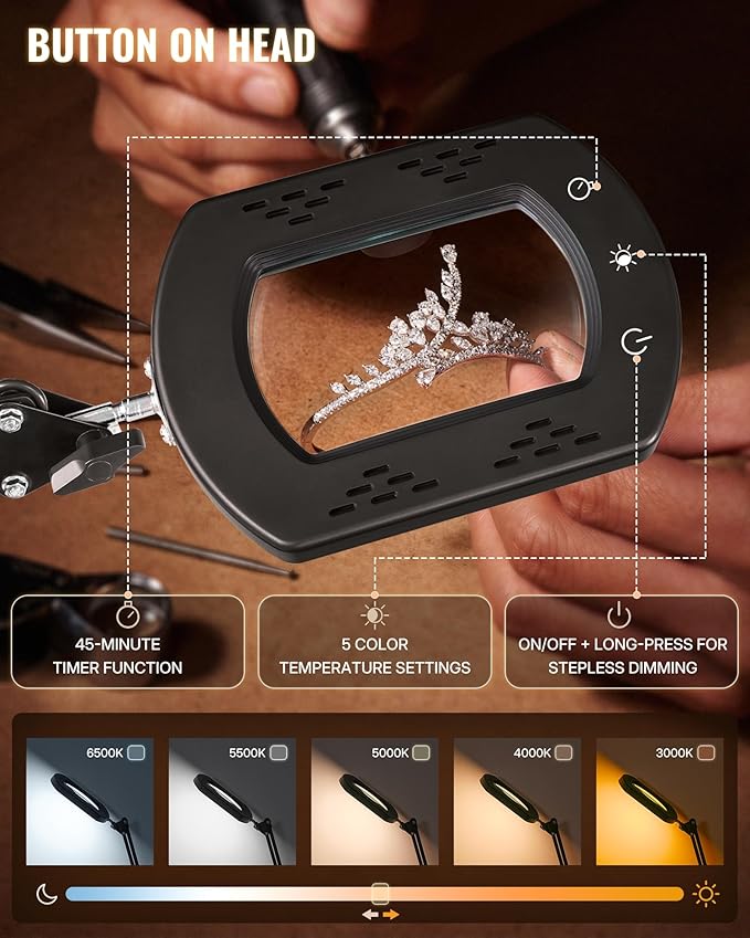 • 5 Color Temperatures & Stepless Dimming: Easily adjust the color temperature and brightness via conveniently located controls on the lamp head, allowing you to maintain soft, glare-free illumination for extended reading and fine detail work - no need to bend down