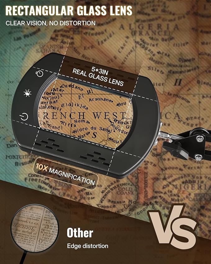 • 10X Rectangular Magnifying Lamp: This magnifying lamp features a 5'' HD optical glass lens for a clear view in intricate tasks like reading, crafting, painting, jewelry making, and sewing. It emits a soothing, warm light with a 45-minute timer to encourage regular breaks and reduce eye strain