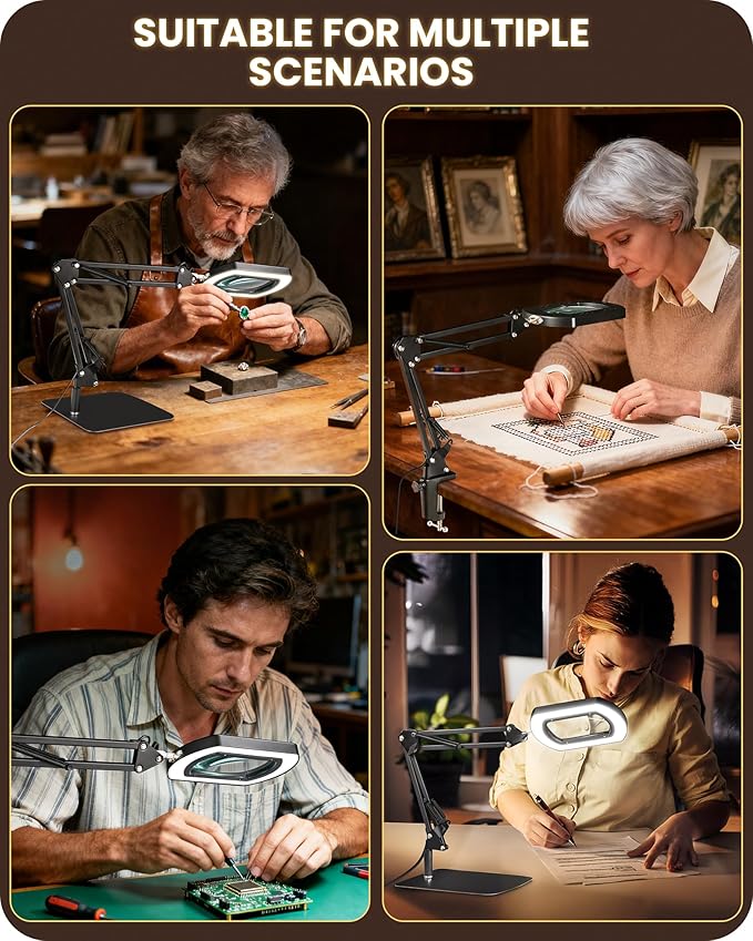 • Versatile 2-in-1 Magnifier Lamp: Not just a magnifier, but also a clip-on desk lamp. This lamp's clamp firmly onto surfaces up to 2.1'' thick, ideal for desks, workstations, and laboratory tables, thus enhancing both efficiency and comfort in diverse environments