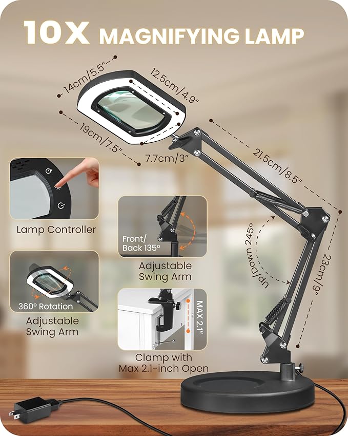 • Versatile 2-in-1 Magnifier Lamp: Not just a magnifier, but also a clip-on desk lamp. This lamp's clamp firmly onto surfaces up to 2.1'' thick, ideal for desks, workstations, and laboratory tables, thus enhancing both efficiency and comfort in diverse environments