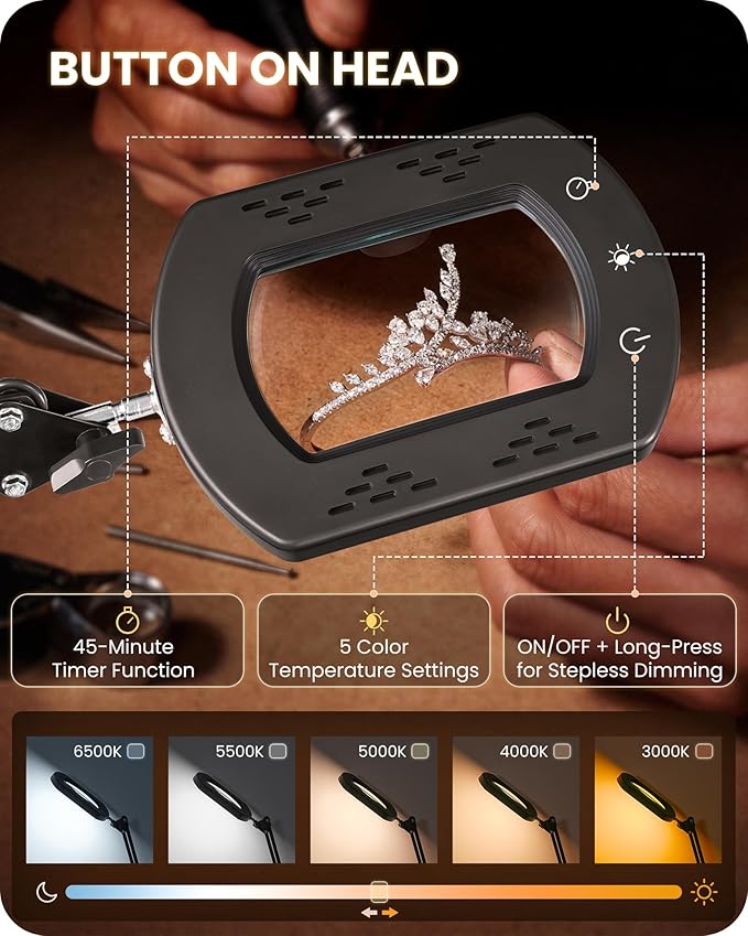 • 5 Color Temperatures & Stepless Dimming: Easily adjust the color temperature and brightness via conveniently located controls on the lamp head, allowing you to maintain soft, glare-free illumination for extended reading and fine detail work - no need to bend down