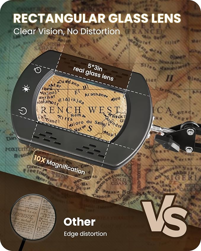 • 10X Rectangular Magnifying Lamp: This magnifying lamp features a 5'' HD optical glass lens for a clear view in intricate tasks like reading, crafting, painting, jewelry making, and sewing. It emits a soothing, warm light with a 45-minute timer to encourage regular breaks and reduce eye strain
