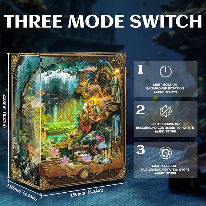 • 3-Touch Modes for Total Immersion: Tap to set the vibe! Mode 1: Spinning background, dazzling lights, and adventure melodies. Mode 2: Rotation + lights for soft, mysterious ambiance. Mode 3: Off—ready to restart your dive. It’s not just a kit; it’s a portal to the deep