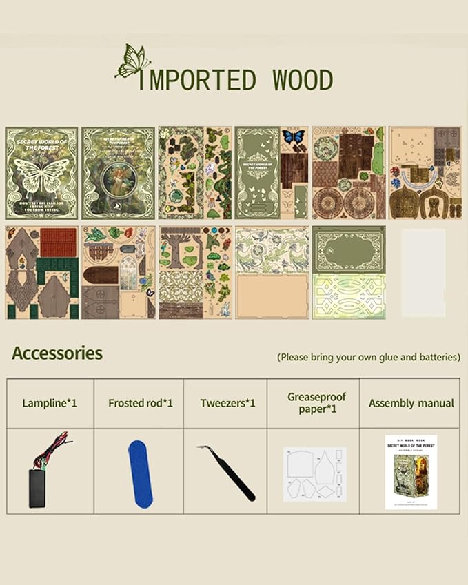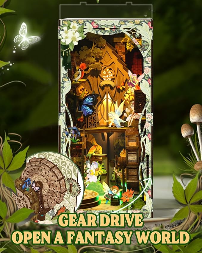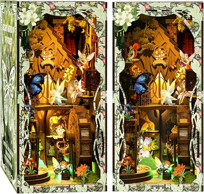 • LittleTimbers Book Nook Kit Miniature Dollhouse:Tucked away from the city's noise lies a forest forgotten by time. Where morning dew kisses the grass and sunlight filters through the canopy, a woven cottage of trees and vines glows softly. Here live little fairies with translucent wings and shining eyes—guardians of the woods. They understand the songs of the wind and the whispers of flowers, using their magic to protect the life of the forest
