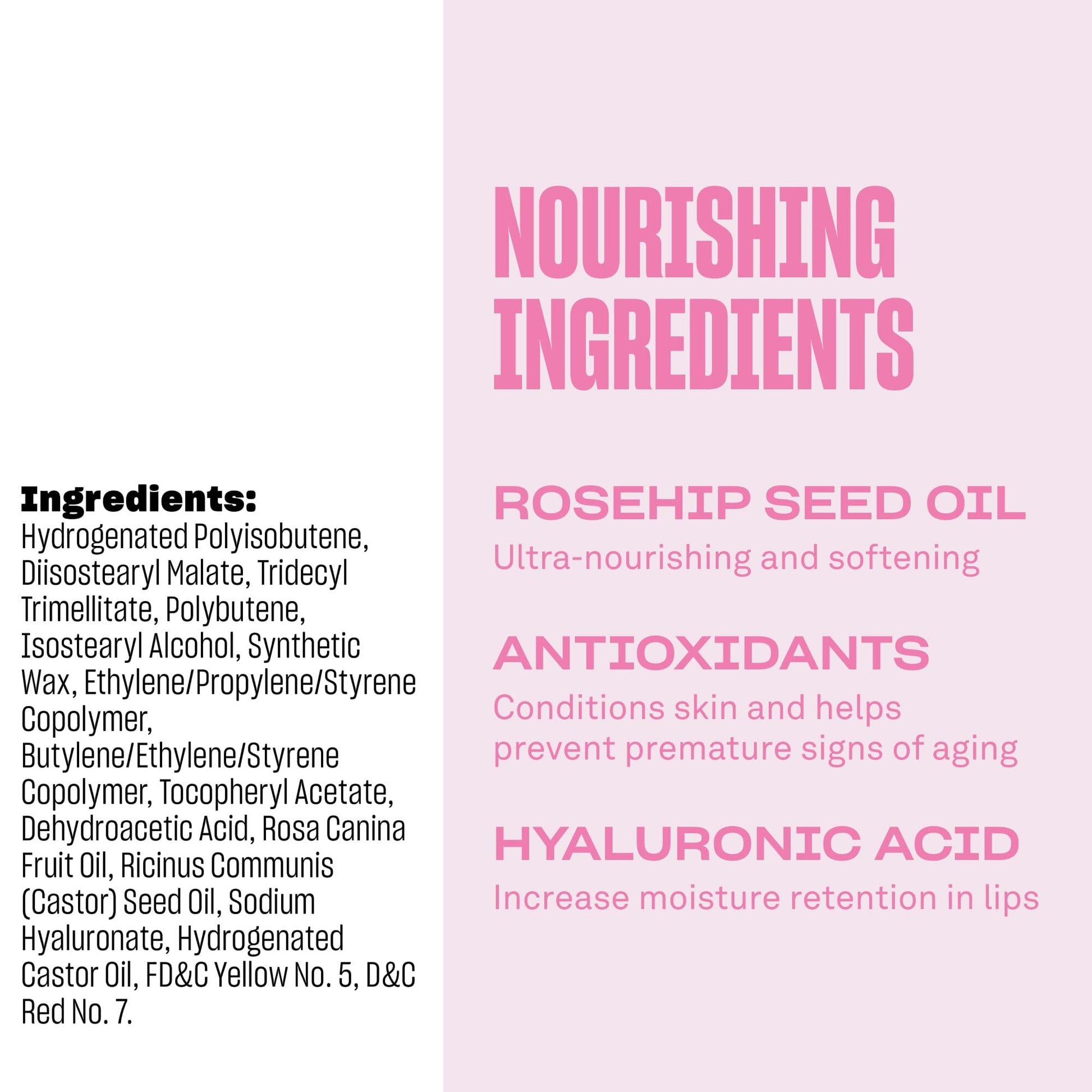 • Comfort lips with nourishing ingredients like hyaluronic acid and rosehip oil