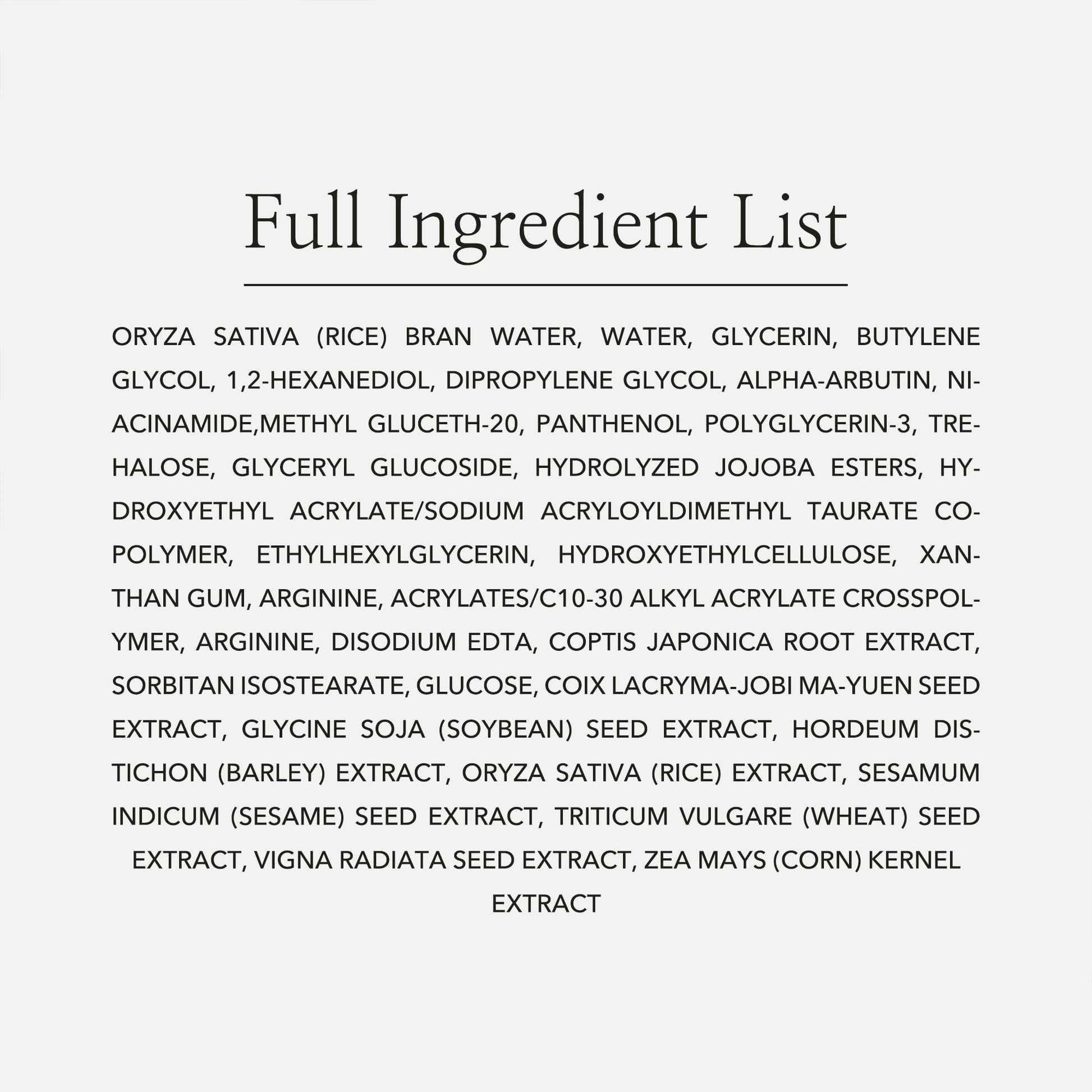 Key Ingredients: Rice Water 68%: Moisturizing, hydration and glowing. Alpha-Albutin 2%: Radiance, dark spots, skin protection and pigmentation. Niacinamide: Skin tone, skin barrier and acne care.