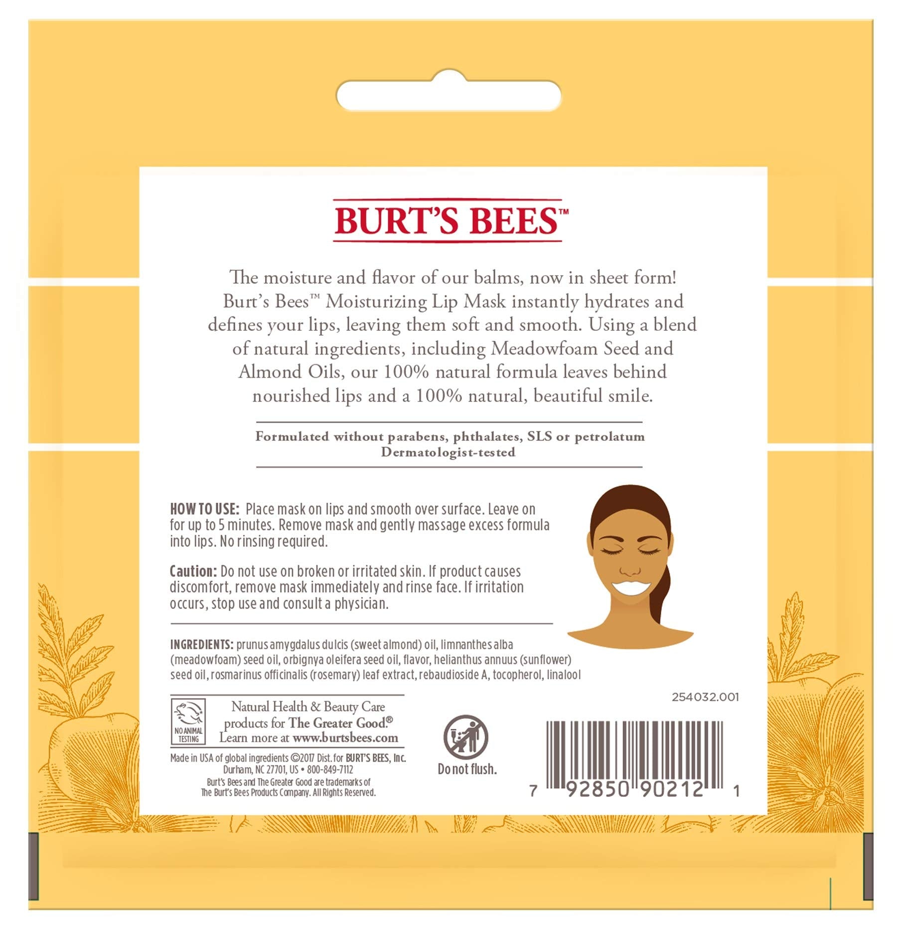 Details: Burt’s Bees Moisturizing Overnight Lip Mask instantly moisturizes, hydrates and defines your lips with a blend of natural ingredients, including Meadowfoam Seed and Almond Oils. Single-use, this lip moisturizer features leaves behind soft, smooth and nourished lips that feel happy, juicy and healthy. This total hydration Burts Bees Lip Mask is super easy to use. Simply lift the sleeping lip mask from the pouch, apply the mask over your lip, wait up to five minutes and gently remove it. Formulated without parabens, phthalates, petrolatum and SLS, this mask is 100 percent natural to revitalize and beautify lips with clean ingredients. It is also dermatologist-tested. Add Burt's Bees Overnight Lip Mask to your beauty routine to recondition your pout and change your lipstick game. Give yourself a beautiful smile with this at-home spa experience that's 100 percent natural origin lip care. Playing by nature’s rules since 1984, Burt’s Bees uses ingredients from nature to nourish and revitalize your skin and lips, making products that have become a staple of your household.