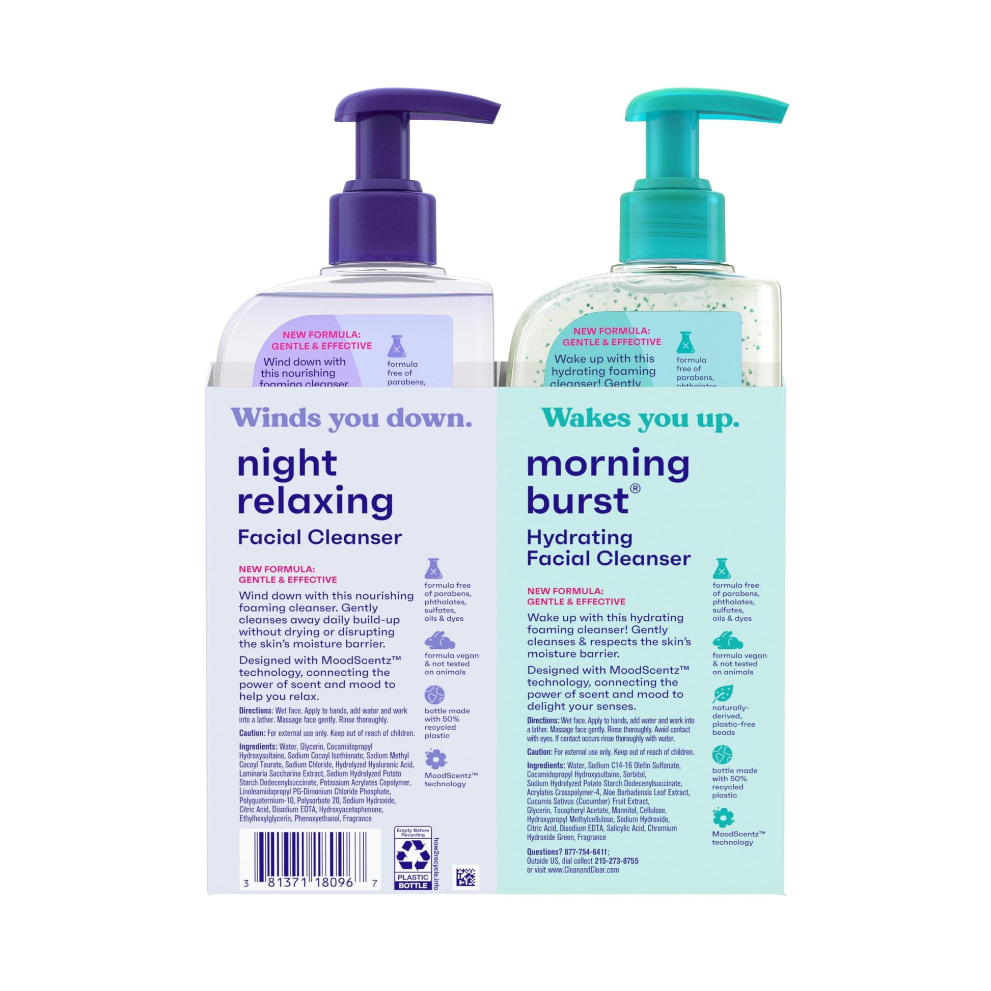Details: Get clean, fresh skin morning and night. This value pack contains two Clean & Clear oil-free, deep cleaning face washes to add to your daily skincare routine: Morning Burst Hydrating Facial Cleanser and Night Relaxing Deep Cleansing Wash. Suitable for daily use, both cleansers are oil-free and clean deep down to pores to remove dirt, oil, and impurities. The foaming morning cleanser is formulated with an invigorating scent to help you wake up and a blend of cucumber and green mango extracts. It cleans deep while refreshing skin with an added touch of moisture. The purifying night cleanser combines calming aromas, deep sea minerals, and sea kelp extract, and cleanses away daily build-up gently yet deeply without over-drying, leaving you feeling clean and relaxed. To use the cleansers, gently massage all over wet face, rinse thoroughly, and pat dry.