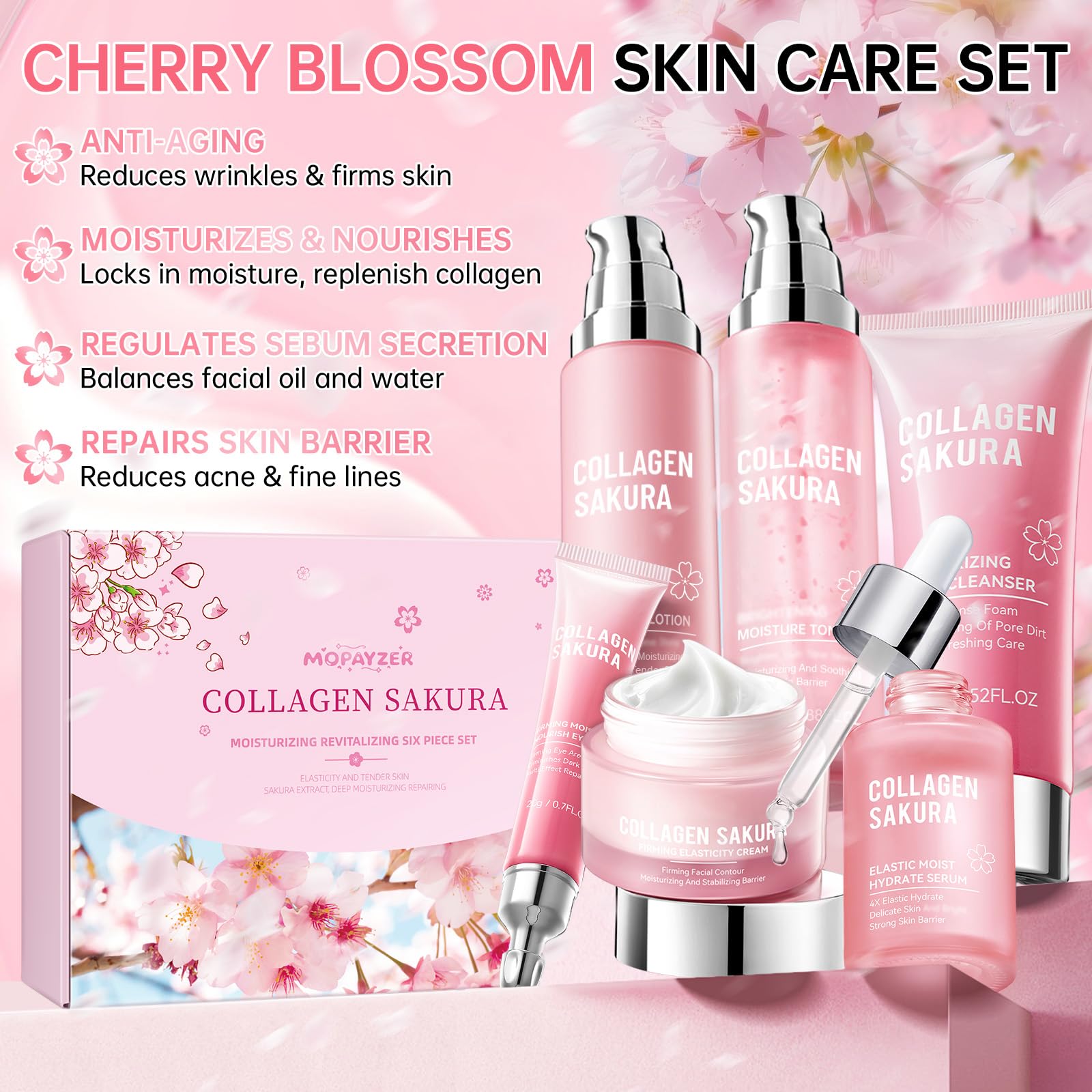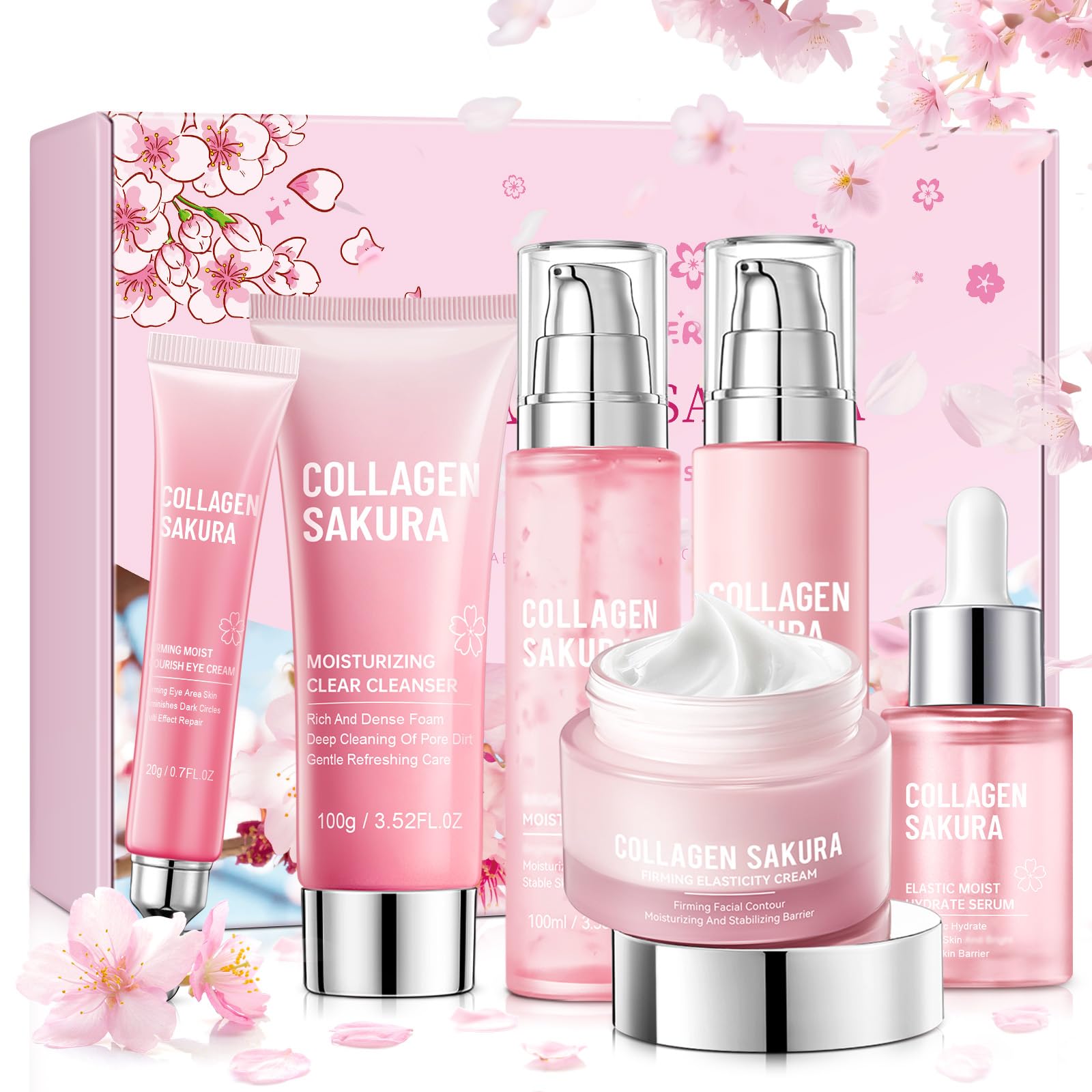 Collagen Sakura Skincare Gift Set, Cherry Blossom Skin Care Set for Teen Girls & Women, Moisturizing & Revitalizing Skin, 6Pcs Collagen Skin Care Routine Kits for Face, Korean Daily Skin Care