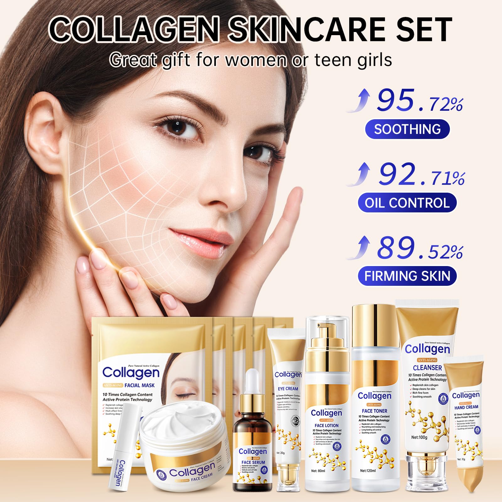 Collagen Skin Care Set,13-In-1 Travel Skincare Kits for Firming Skin, Shrink Pores, Anti Aging Skincare Set for Reduce Wrinkles.Smooth Fine Lines.Hydrating,Facial Kits for Women & Girls.
