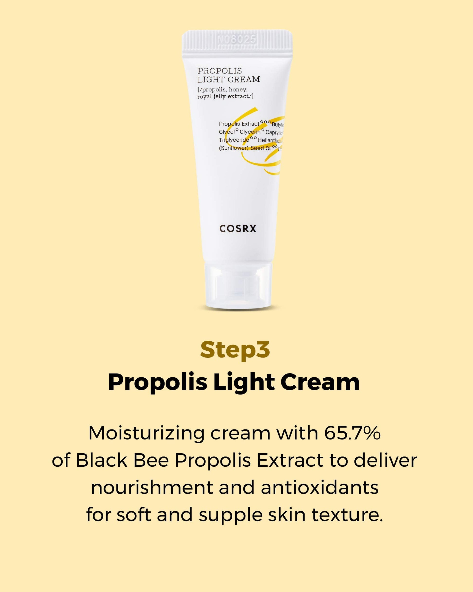 • Propolis Synergy Toner 1.01 fl. oz, Propolis Light Ampoule 0.33 fl. oz, Propolis Light Cream 0.50 oz.