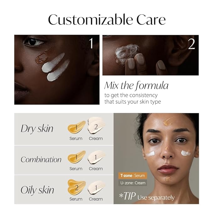 • Customizable Dual Formula: a 2-in-1 intensive skin care system, the 'Aqua Serum' provides deep hydration and skin relief, and the 'Intense Cream' provides nutrition and elasticity.