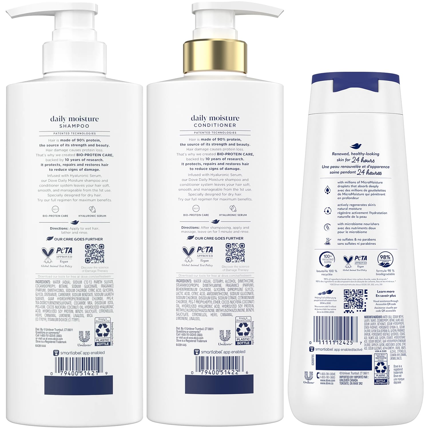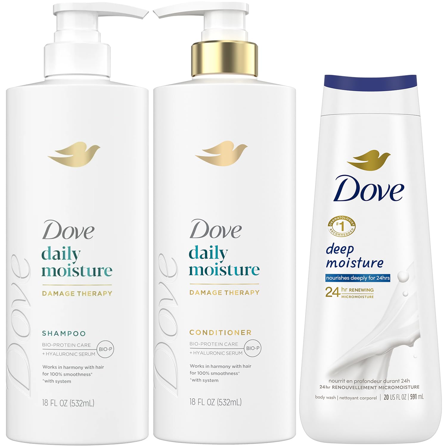 • COMPLETE HAIR & SKIN CARE: This bundle includes the Dove Daily Moisture Shampoo and Conditioner (18 oz ea) plus the Deep Moisture Body Wash (20 oz)—your go-to daily solutions for softening and smoothing skin and hair.