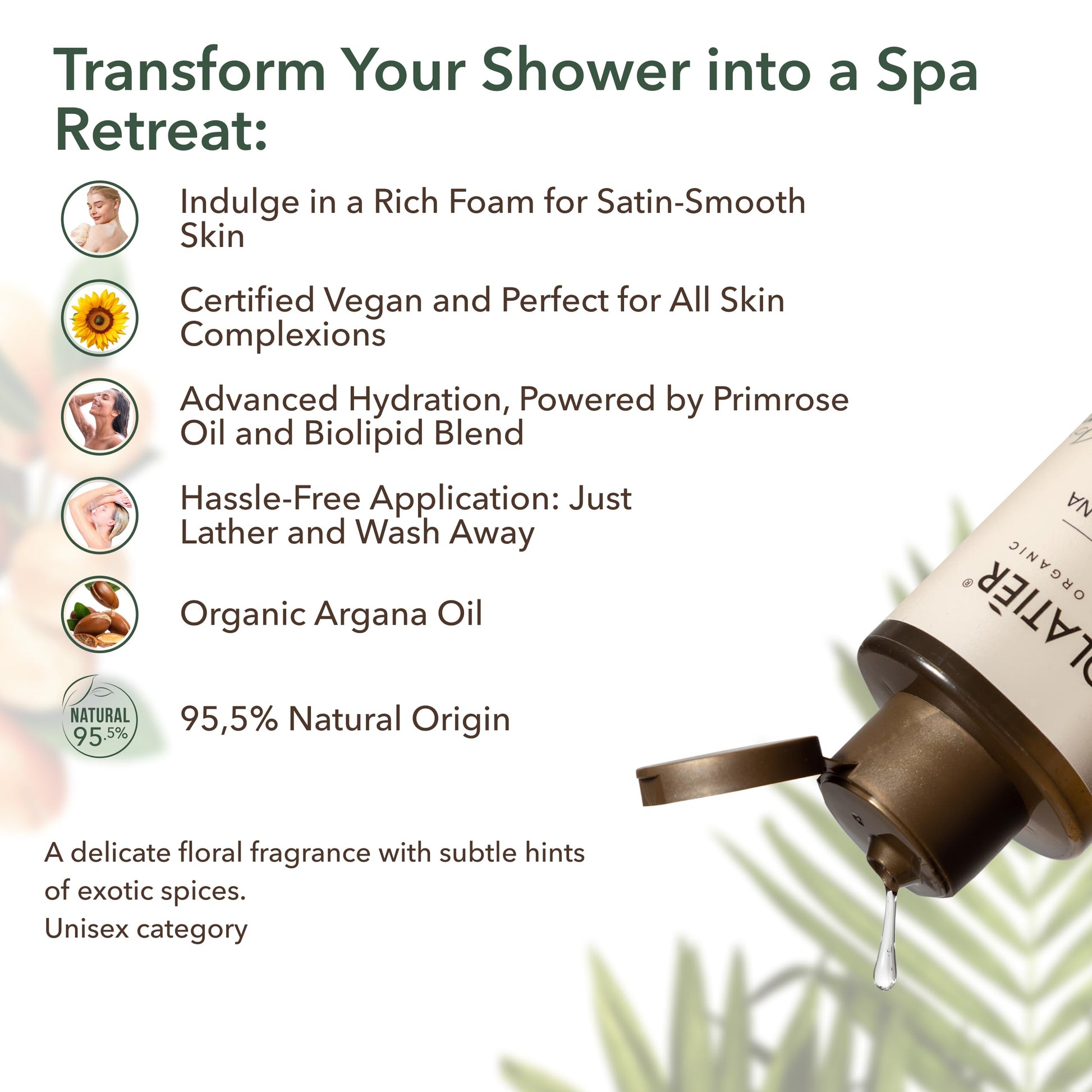 Shower Oil Deep Reviving: Organic Argana Oil hydrates, boosts elasticity, and restores skin health. Primrose Oil and Biolipid Complex support skin microbiota balance.
