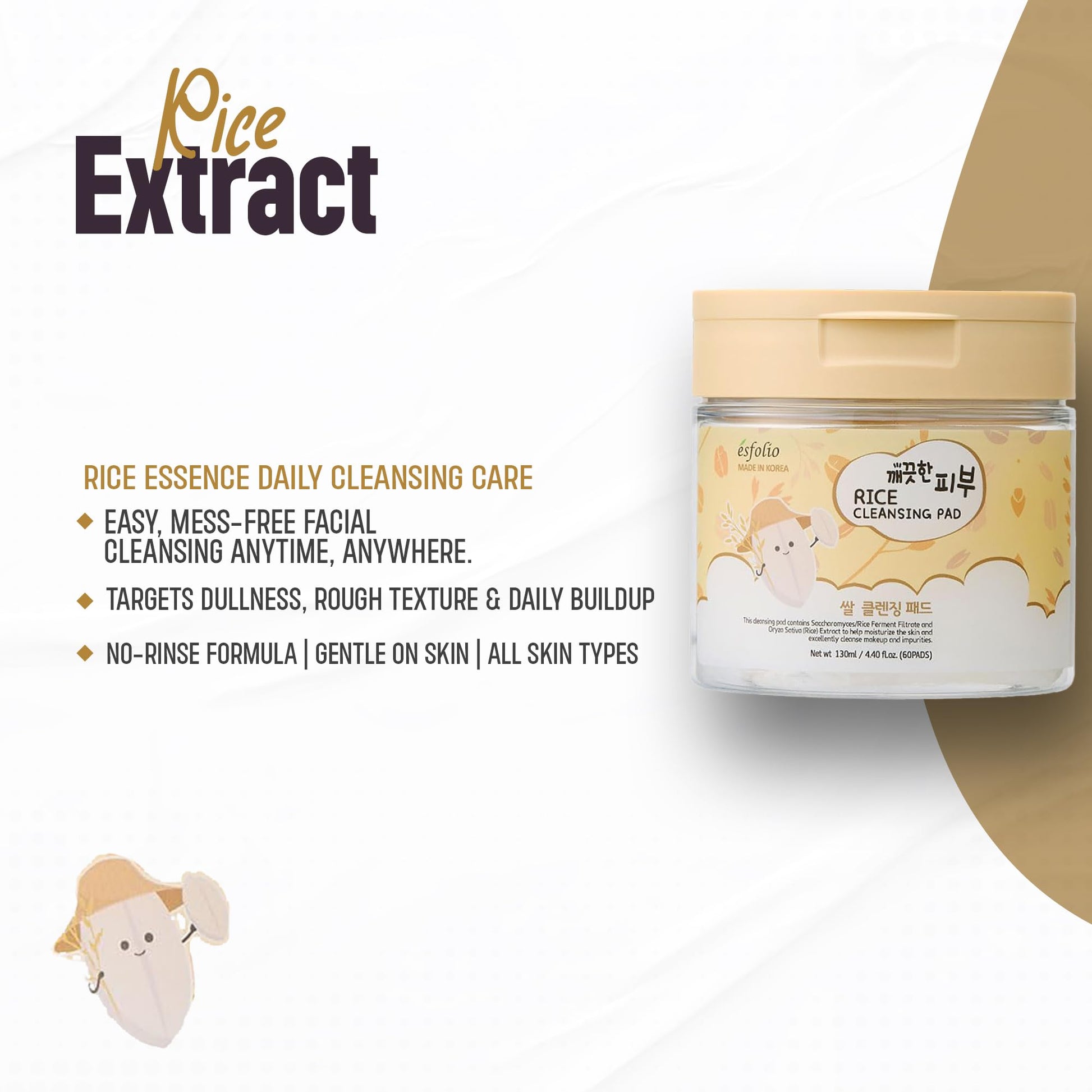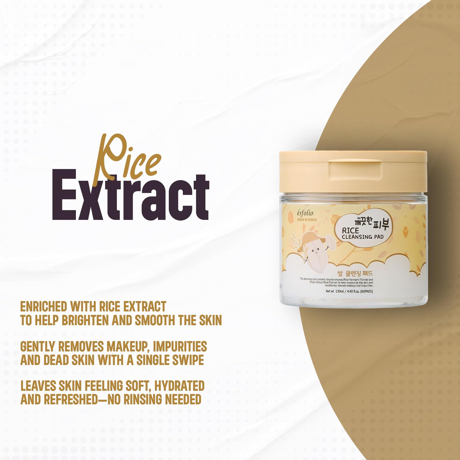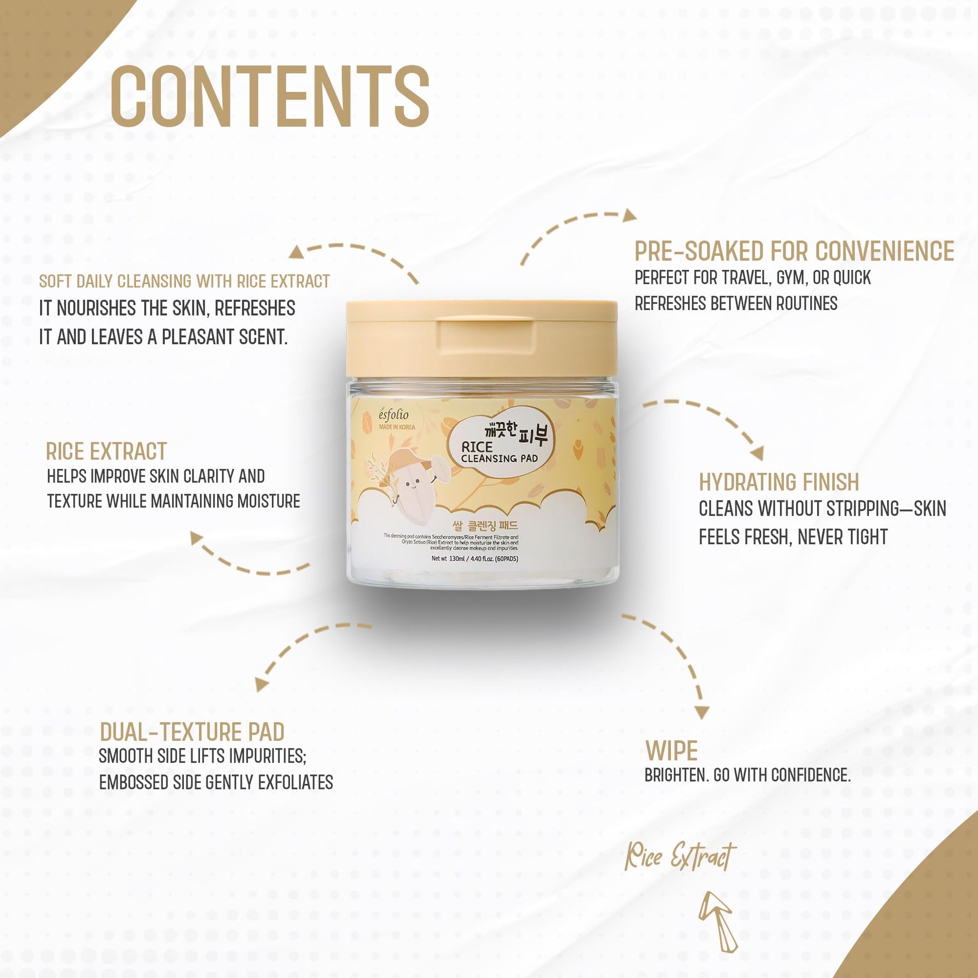 Details: Esfolio Rice Cleansing Pad offers an easy and effective way to refresh your skin in one step. Infused with rice extract and fermented rice filtrate, these pre-moistened pads help sweep away dirt, oil, and daily buildup while promoting a soft and radiant appearance. Each pad is designed with a dual-textured surface—one for gentle exfoliation and one for smoothing and hydrating. Perfect for use at home or on the go, they simplify your skincare routine while delivering a fresh, clean finish. Each container includes 60 individually soaked pads suitable for all skin types. Dermatologically tested and free from common irritants. Use as the first step in your skincare regimen to prep and tone your face.