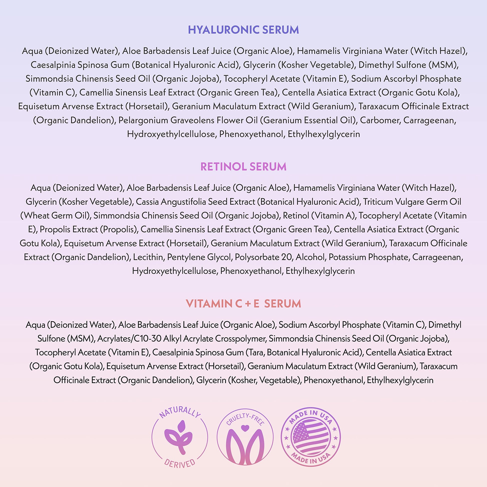 Natural Serum Kit: Hyaluronic Acid Serum, Retinol Serum 2%, and Vitamin C and E Serum are made in the USA with effective natural skincare ingredients, cruelty-free, paraben-free, formaldehyde-free, propylene-free. Additionally, they contain green tea, vitamin E, and aloe