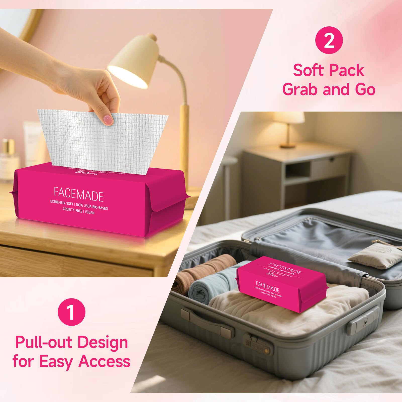 100% Biobased & High Quality: FACEMADE face towels are crafted with the utmost care and precision. These clean face towels disposable are made of 100% viscose fiber. So these clean face towels are soft to the touch and gentle on your skin, ensuring a luxurious feel with every use. Certified 100% Biobased, you can trust in their reliability and quality.