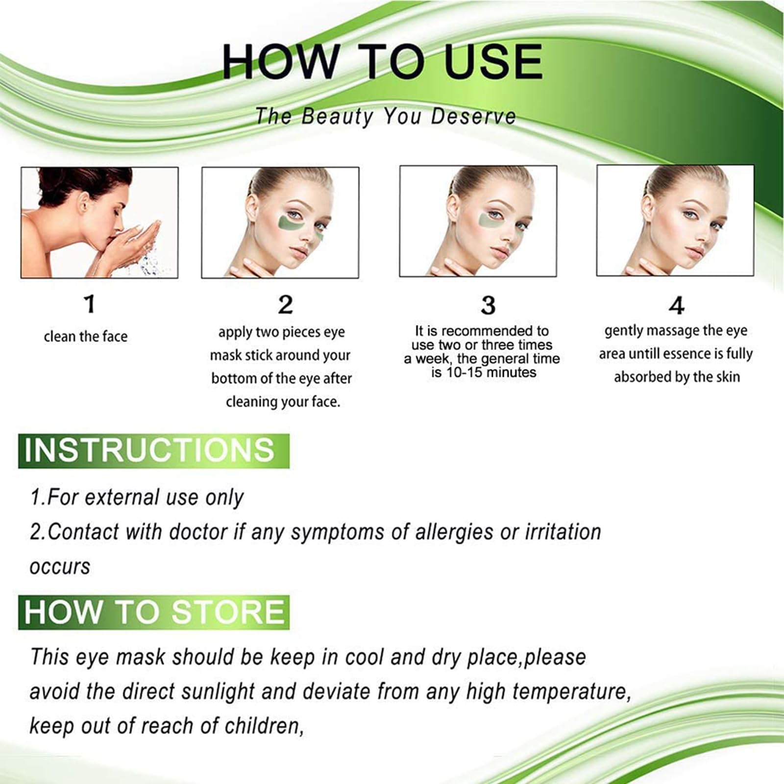Easy To Use - Cleaning your face and then apply eye mask and lip mask,stick around your bottom of the eye or forehead, T zone, lip. Remove the mask until it was fully absorbed about 15-20 minutes, gently massage the skin around eyes and lip.The mask serum will be absorbed perfectly, so you will feel clean and refreshing after using. You can wear it when you are lying or sitting for watching TV, playing cell phone or doing housework