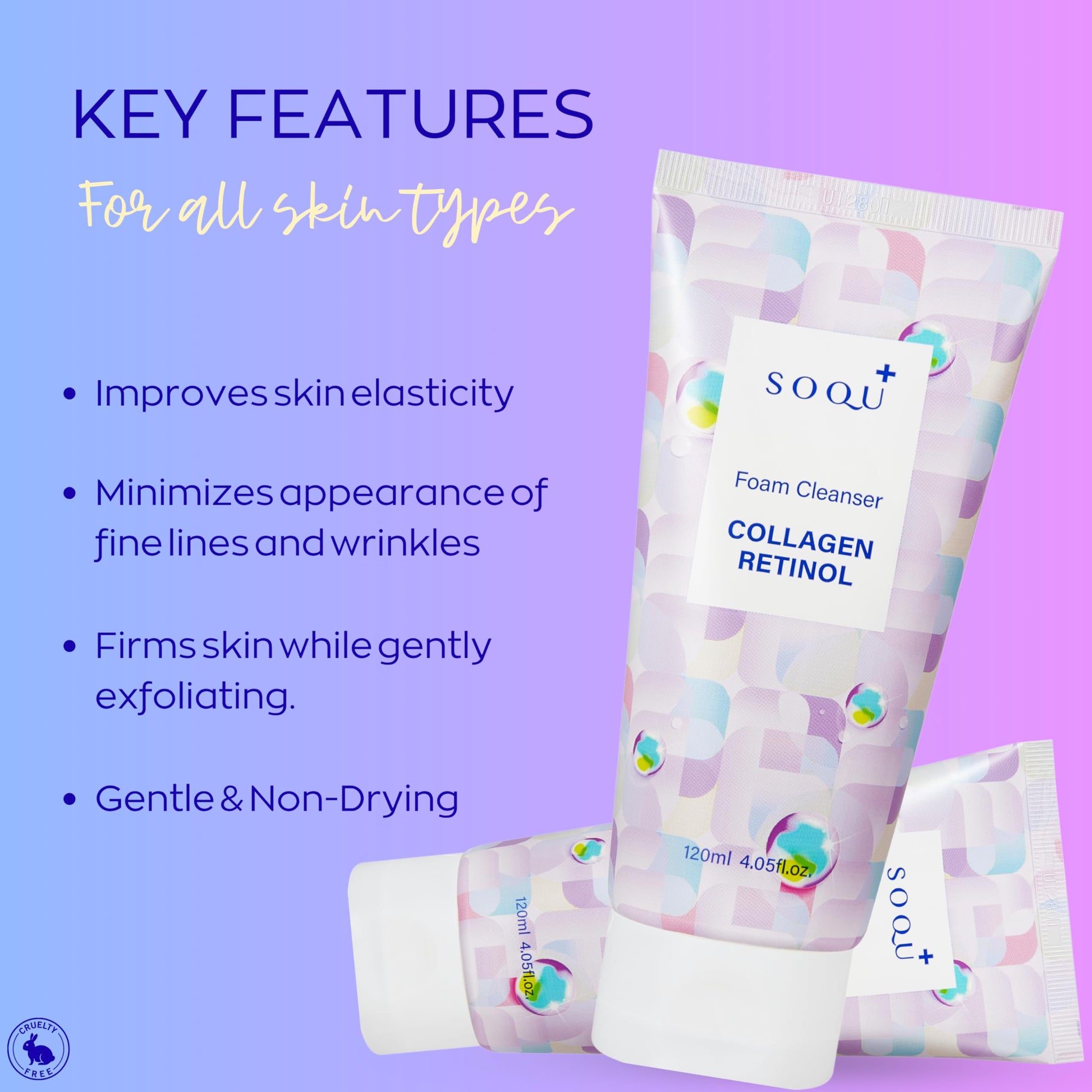 • Skin Firming and Brightening: This gentle foam cleanser combines collagen and retinol to help firm the look of skin while enhancing its natural glow