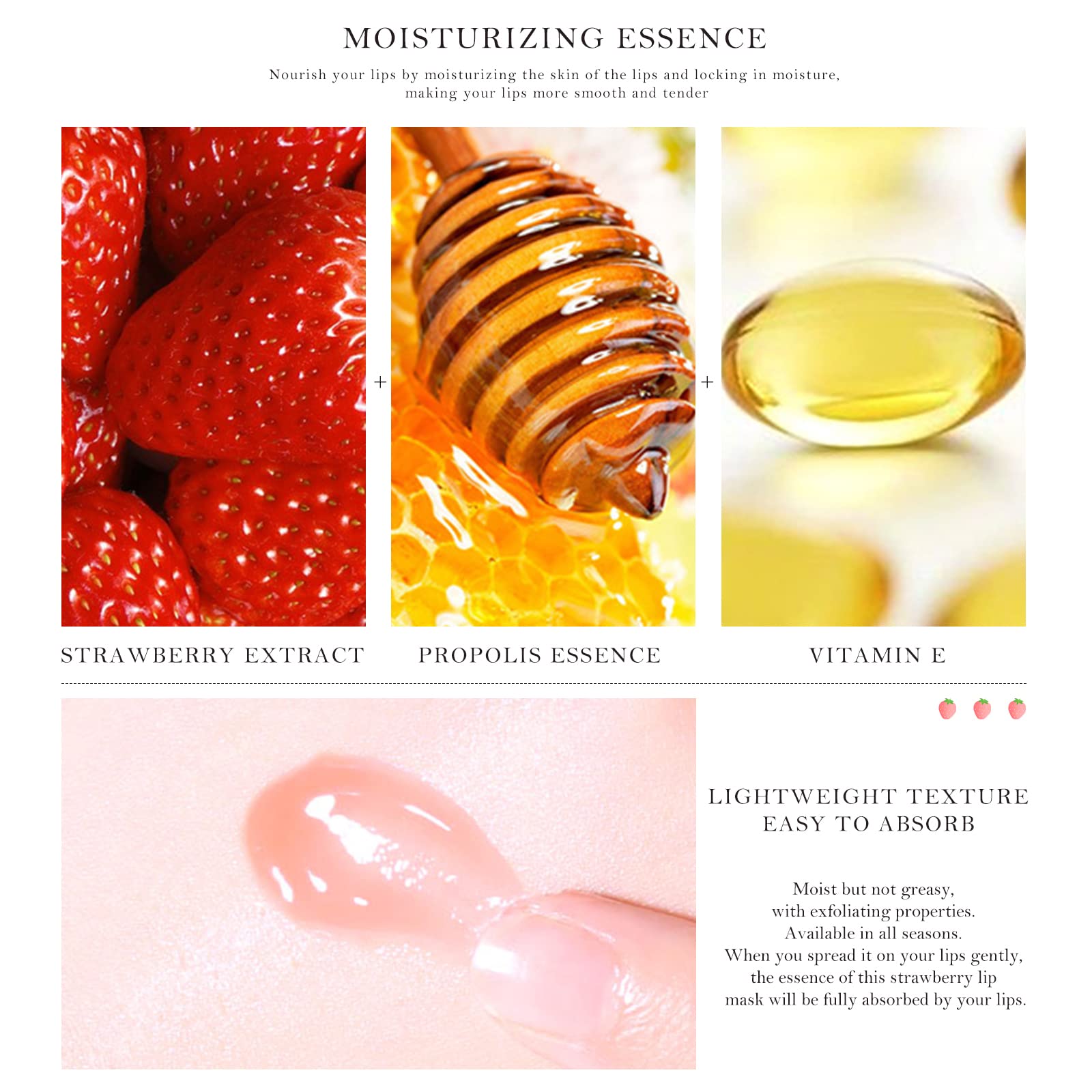 【Moisturizing essence】Strawberry extract, vitamin E and and propolis essence keep lips nourished, soothe the lips, and bring moisturizing lip care effect. Nourish your lips by moisturizing the skin of the lips and locking in moisture, making your lips more smooth and tender.
