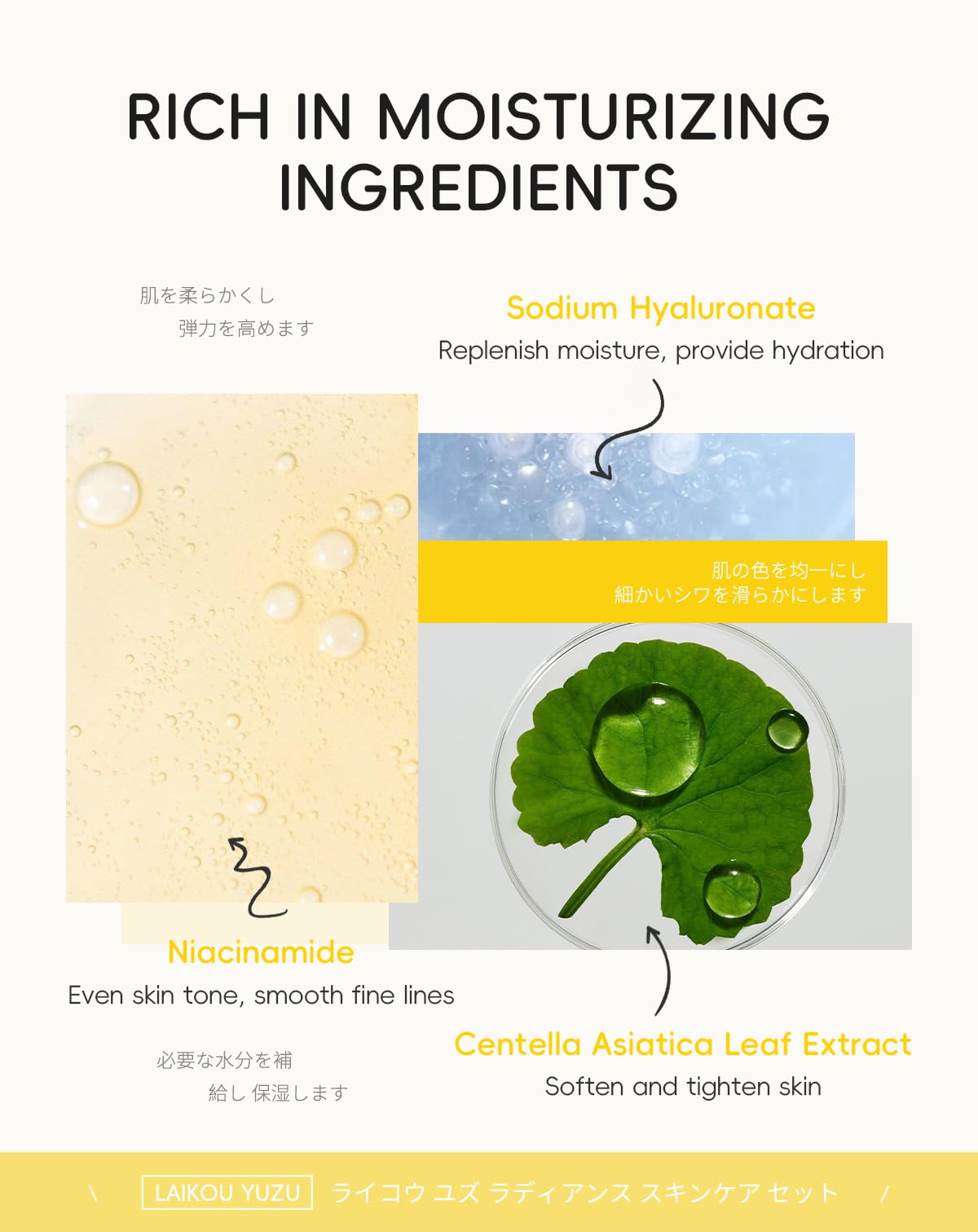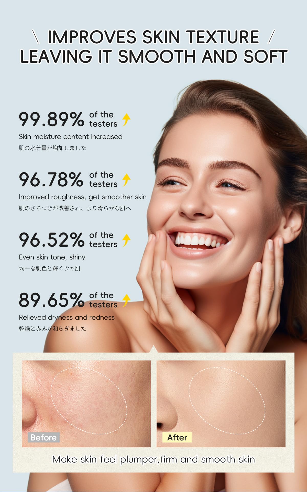 GENTLE FORMULA: Rich in moisturizingingredients, replenishes skin moistureall day long.Formulated withJapanese Yuzu essence, rich in VChelps to improve skin gloss .Won'teave skin feeling greasy.Retains skinmoisture and makes skin feel softer.