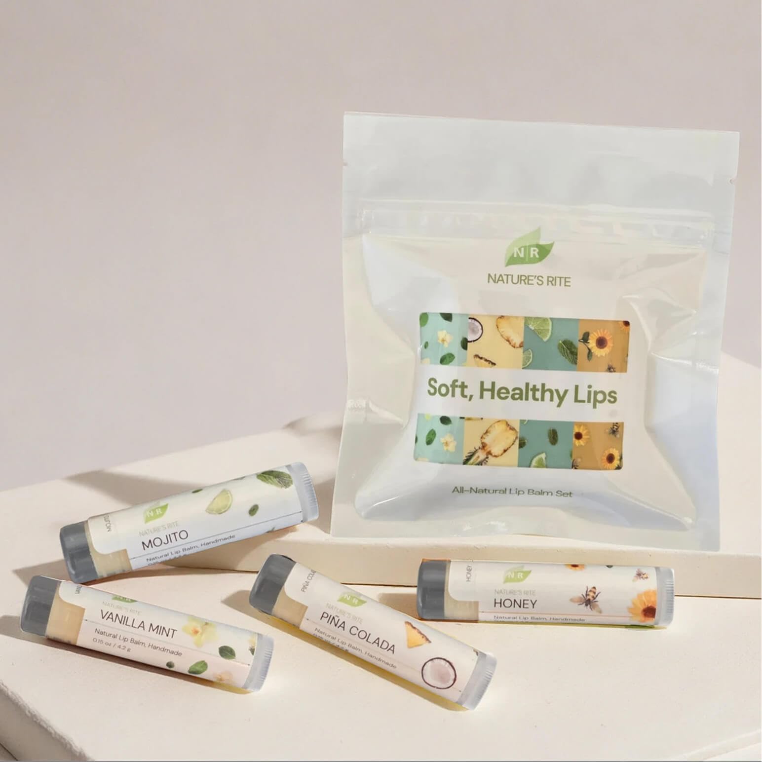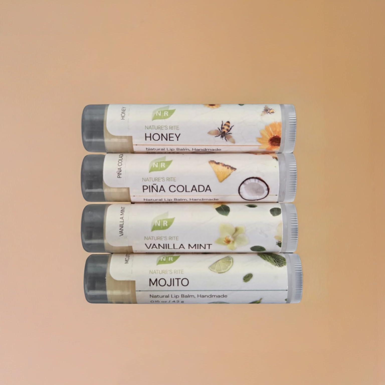 Care Set: One set of 4 handmade lip balms in nourishing flavors: Vanilla Mint, Piña Colada, Honey, and Mojito