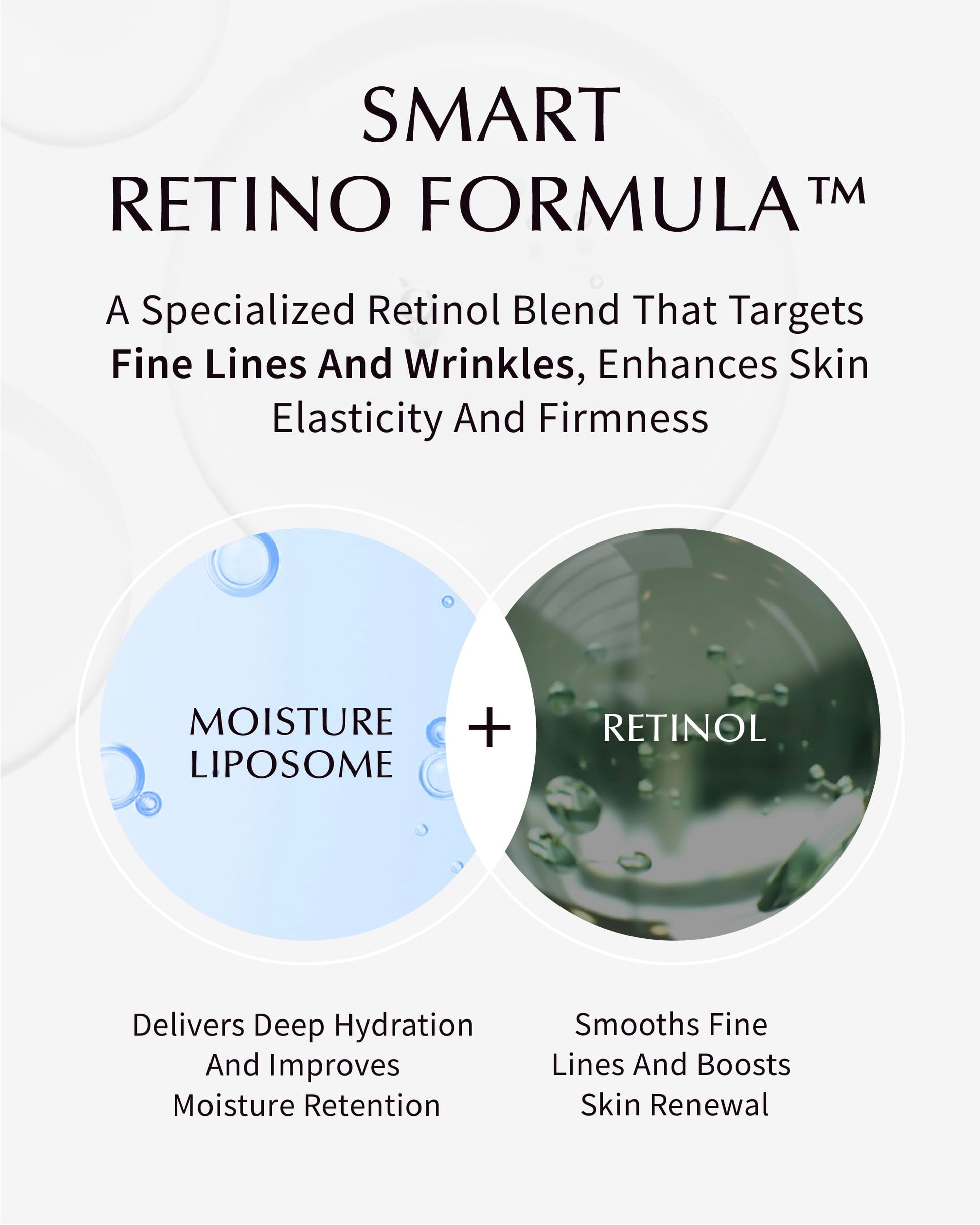 ULTIMATE ANTI-AGING SOLUTION – Smart Retino Formula targets wrinkles and fine lines, while moisture liposome ensures deep hydration. Retinol promotes skin renewal, and hydroxyproline boosts collagen for improved resilience and elasticity.