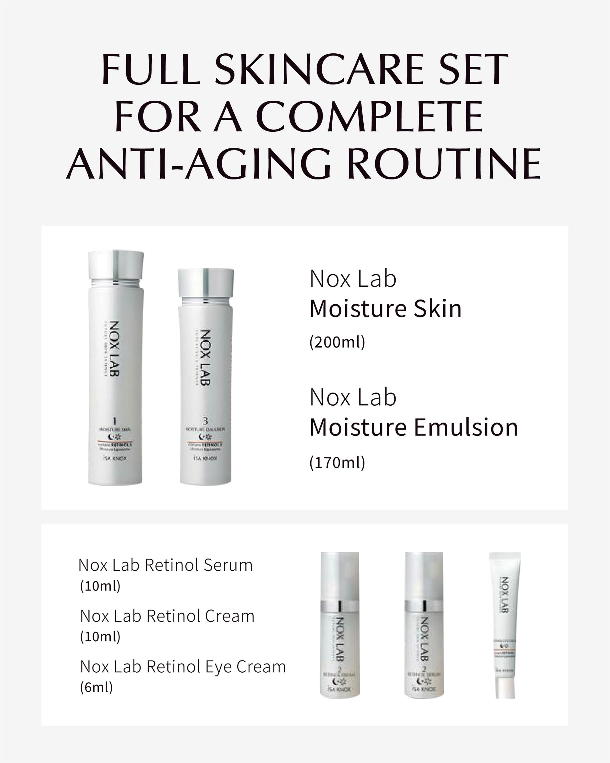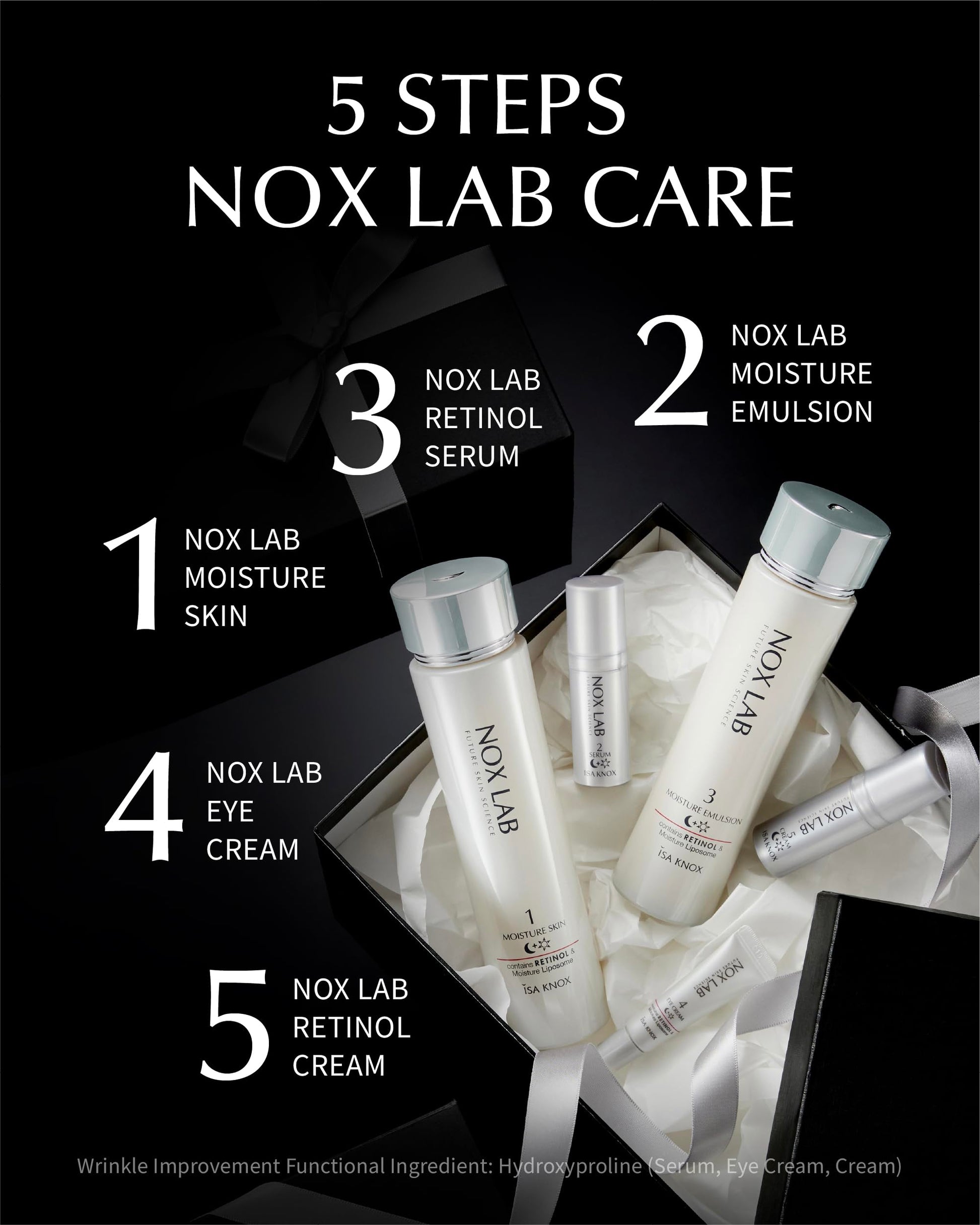 ISA KNOX NOX LAB SMART EDITION SET – Nox Lab Moisture Skin (200ml/6.76 fl oz) + Nox Lab Moisture Emulsion (170ml/5.74 fl oz) + Nox Lab Retinol Serum (10ml/0.34 fl oz) + Nox Lab Retinol Cream (10ml/0.34 fl oz) + Lab Retinol Eye Cream (6ml/0.2 fl oz). A premium anti-aging skincare set infused with Smart Retino Formula to enhance hydration, elasticity, and wrinkle care. It includes retinol, moisture liposome, and hydroxyproline to deeply nourish, firm, and restore luminous skin.