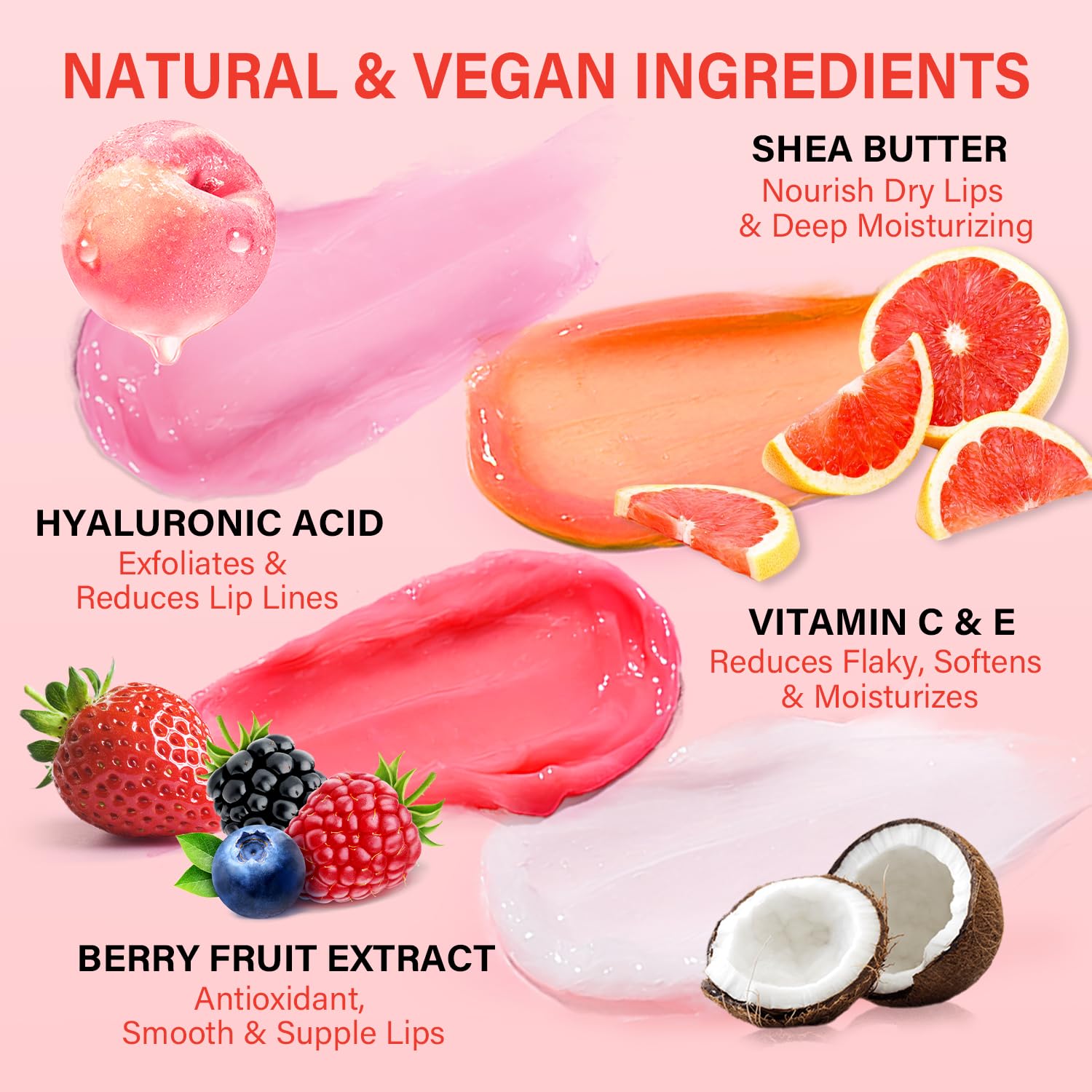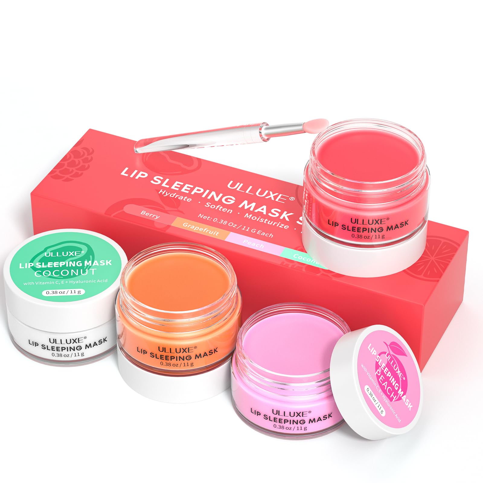【Deep Hydration & Overnight Repair Lip Mask Set】 Lip sleeping mask set 4 pack with four flavors. Experience the delightful scents of sweet berry for fruity indulgence, fresh grapefruit for relaxation, sweet peach, and tropical Coconut for a vacation feel, meeting your needs in different moods. All fragrance-safe and non-irritating. Regular use can help reduce lip lines and give your lips a youthful and plump appearance.