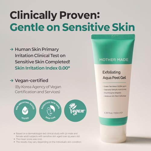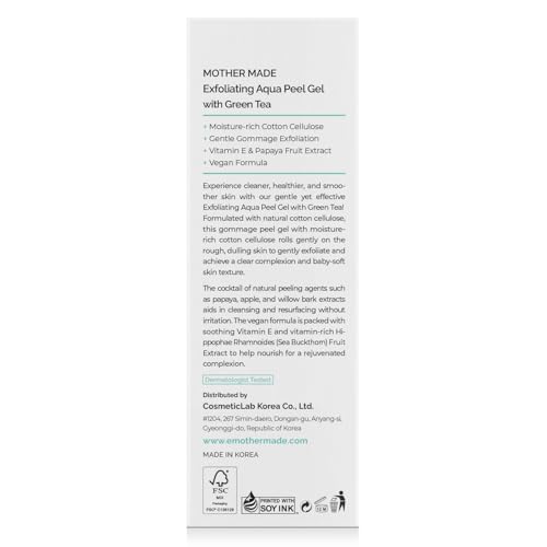 MOTHER MADE LHA Green Tea Exfoliating Aqua Peel Gel, Pore Care, Gentle Facial Exfoliator, Dead Skin Remover, Natural Cellulose for Peeling, Vegan, Korean Skincare, 2 Pack (100ml / 3.38 fl.oz)