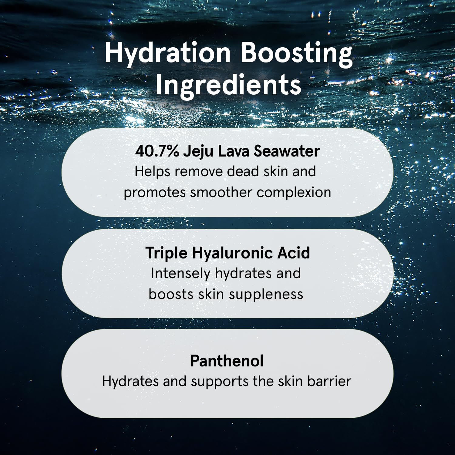FORMULATED WITH 40.7% JEJU LAVA SEAWATER: Containing Jeju Lava Seawater, which is rich in minerals and nutrients, this essence helps to prevent skin dryness and increase moisture, improving the texture of rough skin and leaving it smooth and soft. Patented Triple Hyaluronic Acid and D-panthenol repair damaged skin barrier and make it healthier