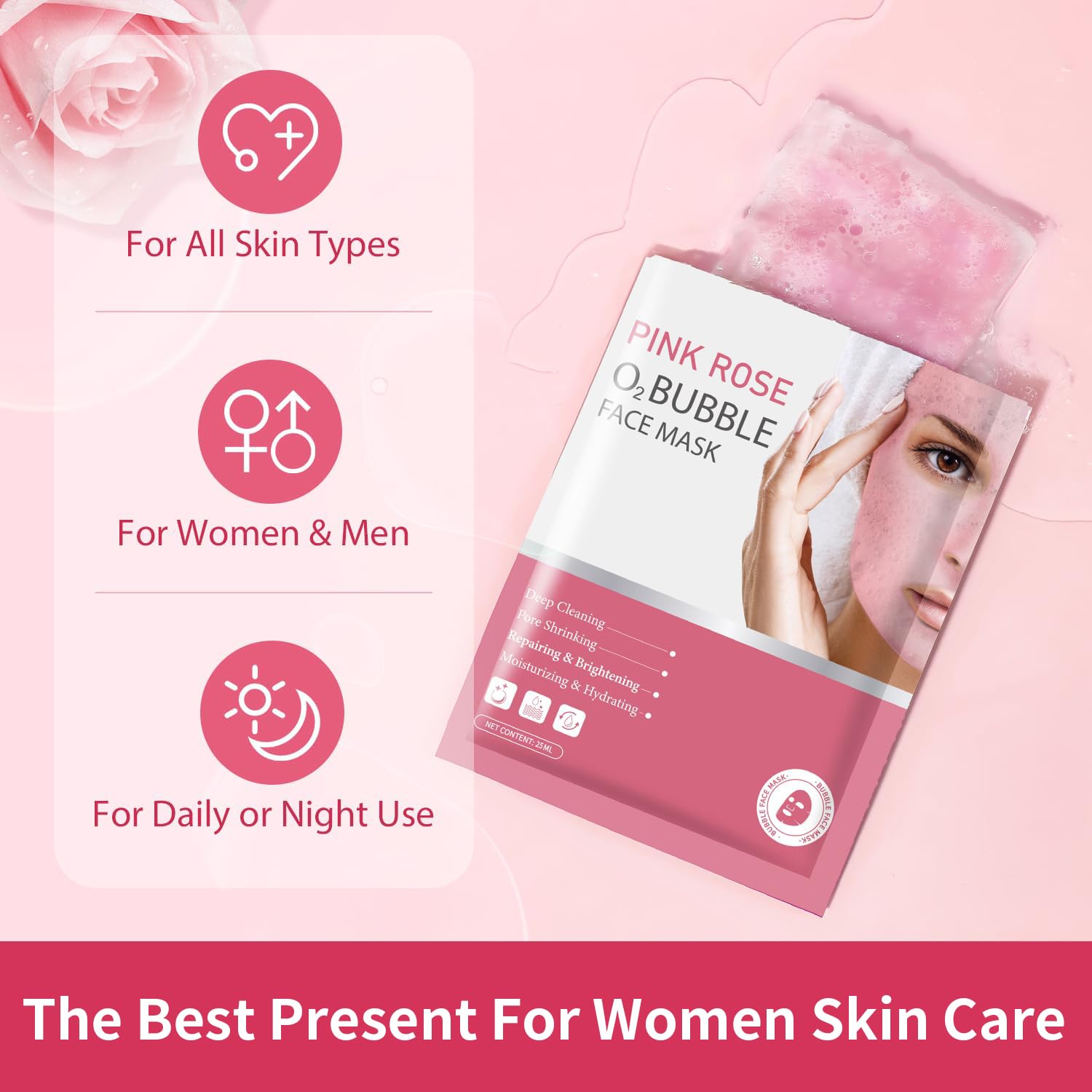 DEEP CLEANSING FORMULA: Our Pink Rose O2 Bubble Face Sheet Mask is specifically designed to deeply cleanse your skin, removing impurities, dirt, and excess oil for a refreshing and rejuvenating experience.