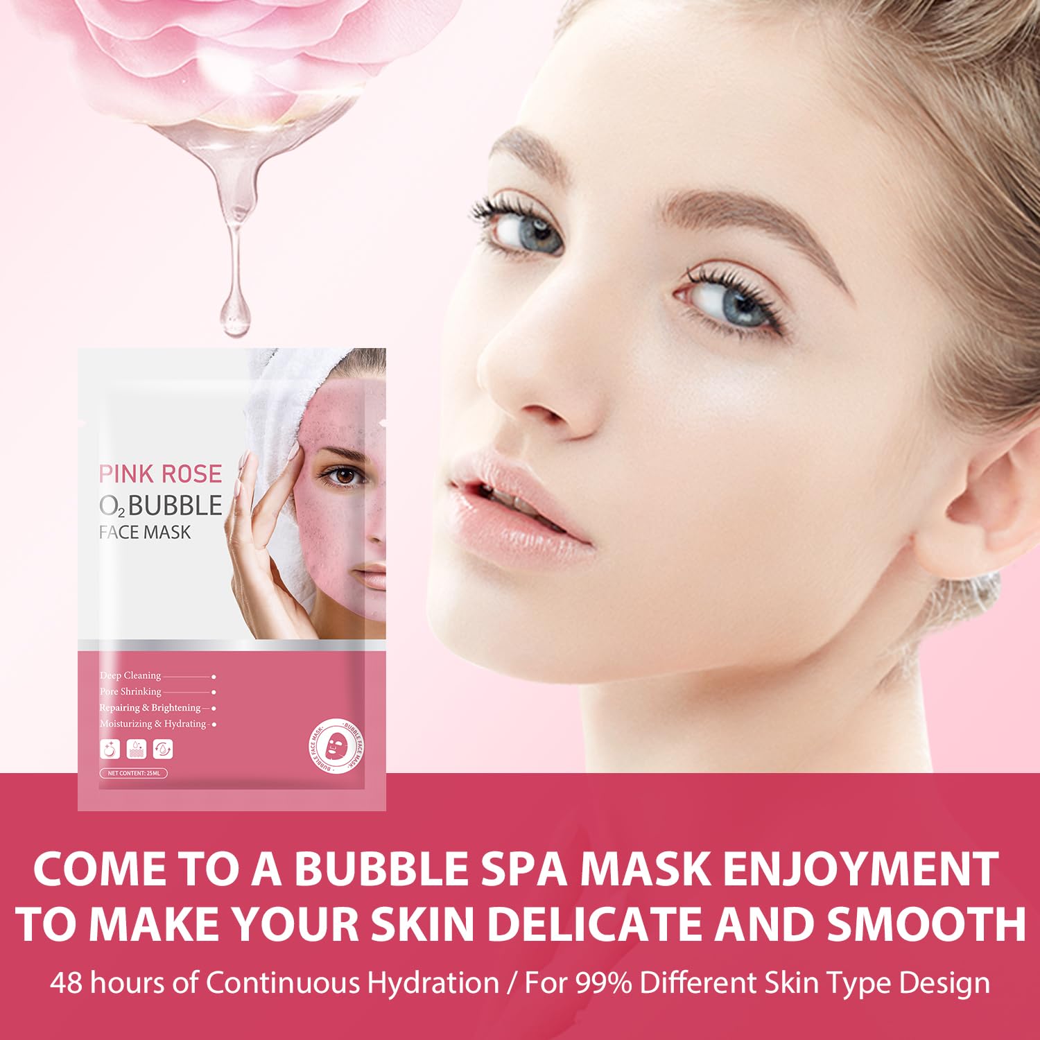 PINK ROSE O2 BUBBLE FACE MASK: Rose is a very gentle, safe, effective skincare and good smell ingredient that has antioxidant properties and helps to brighten the skin, firm skin, and moisturizing skin, for a firmer, younger look. The rose-foaming oxygenating face mask was gentle yet effective. The antioxidant properties of roses help brighten and firm your skin, leaving it moisturized and youthful. can feel the nourishing effect it has on your complexion after continuing to use it.