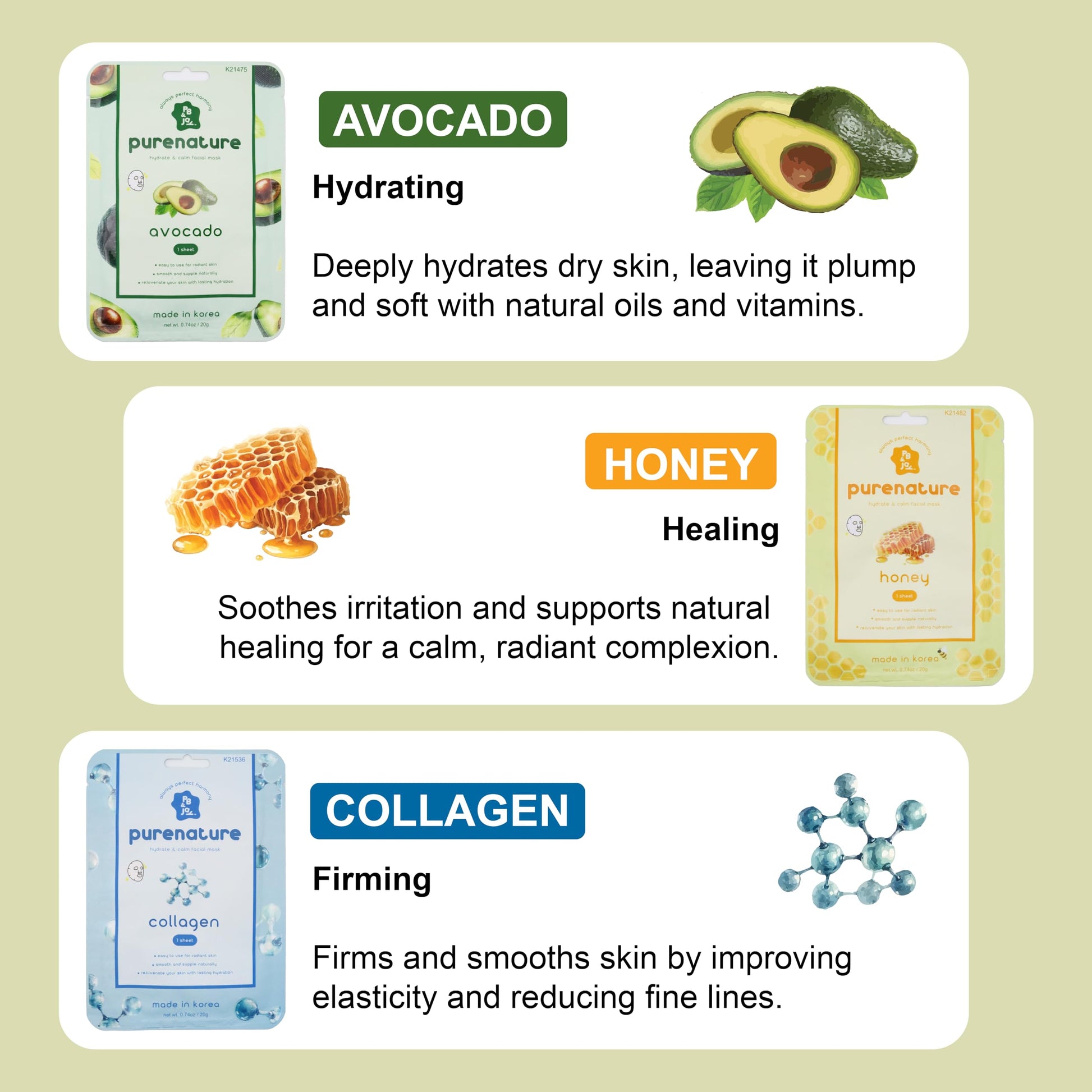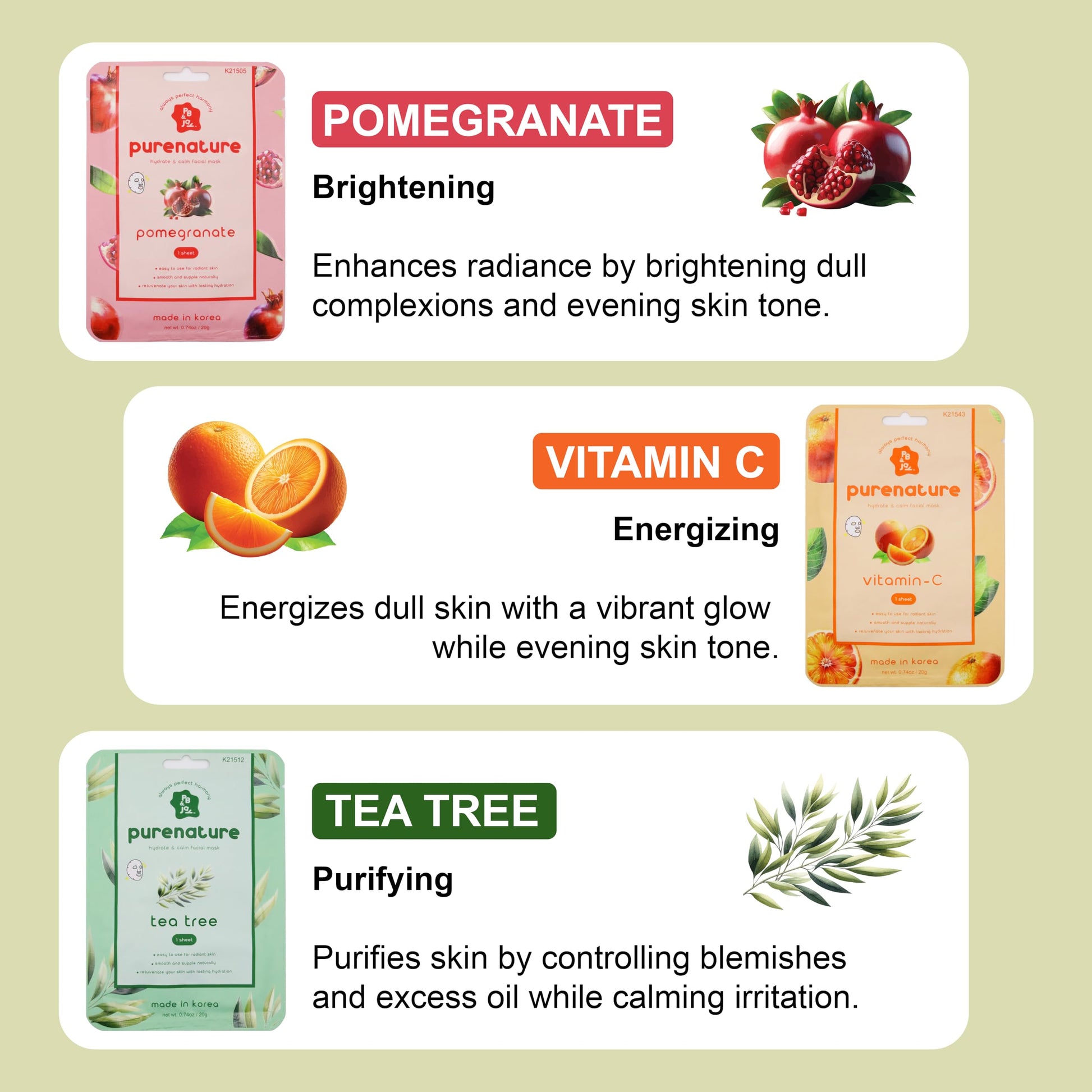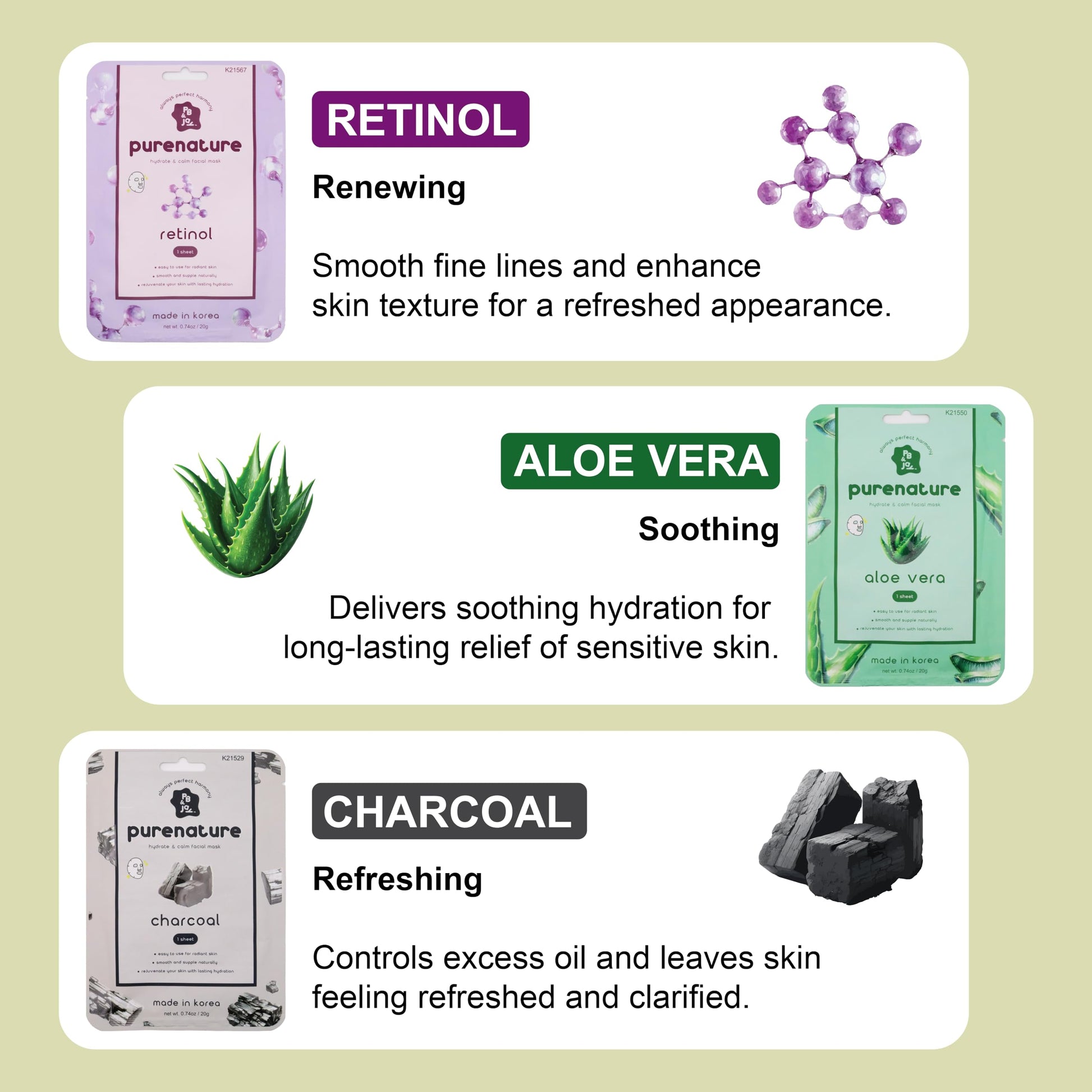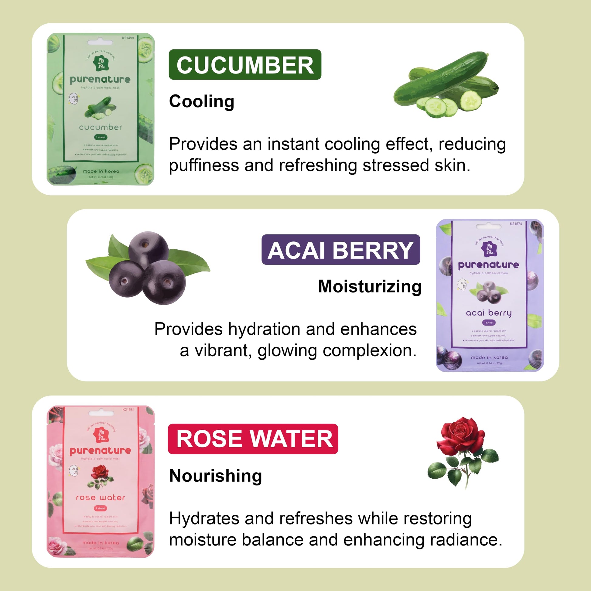 PB&Jay Purenature Hydrate and Calm Facial Mask - 12 Pack Acai Berry,Vita c,retinol and more, Made in Korea, Face Mask Skincare for Hydration, Skincare Face Mask, Moisturizing Mask for Sensitive Skin