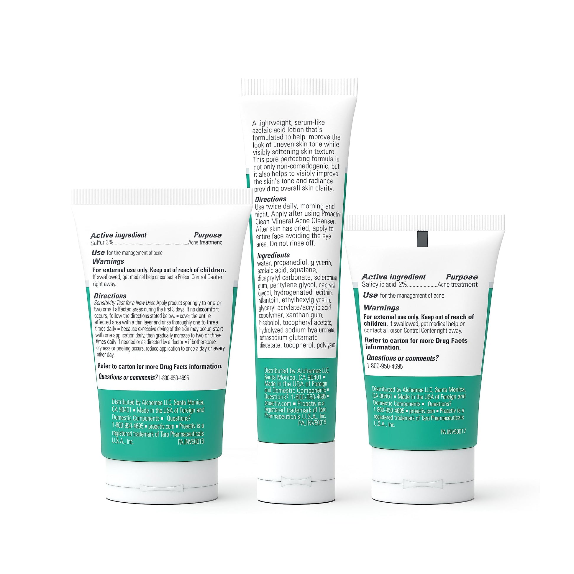The Proactiv Clean 3-Step Acne Treatment Routine includes: Mineral Acne Cleanser, 2 FL. OZ; Azelaic Pore Perfector, 1 FL. OZ; Acne Clearing Hydrator, 1 FL. OZ; Zits Happen Patches, 15 CT- For best results, use the Proactiv Clean 3-Step Routine consistently, morning and night.