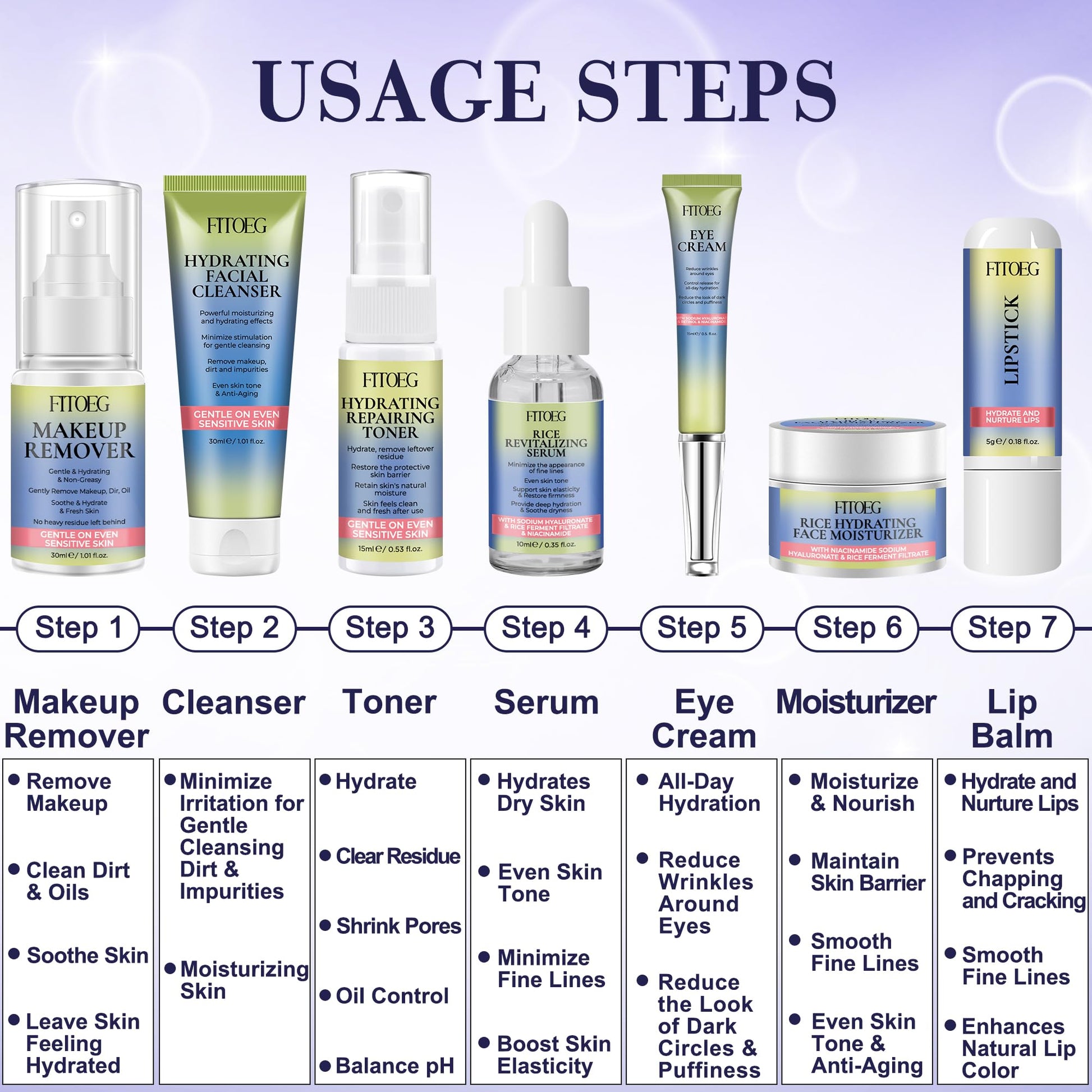 Deep Cleaning,Hydration & Nourishment:The makeup remover gently cleanses,removing makeup,dirt,and oils.The water based cleanser for face cleanses while moisturizing the skin.The facial toner hydrates and clears away any leftover residue.works great for all skin types,including normal,dry,combination.even suit for skin with dehydration & dryness concern.The lipstick nurtures your lips.
