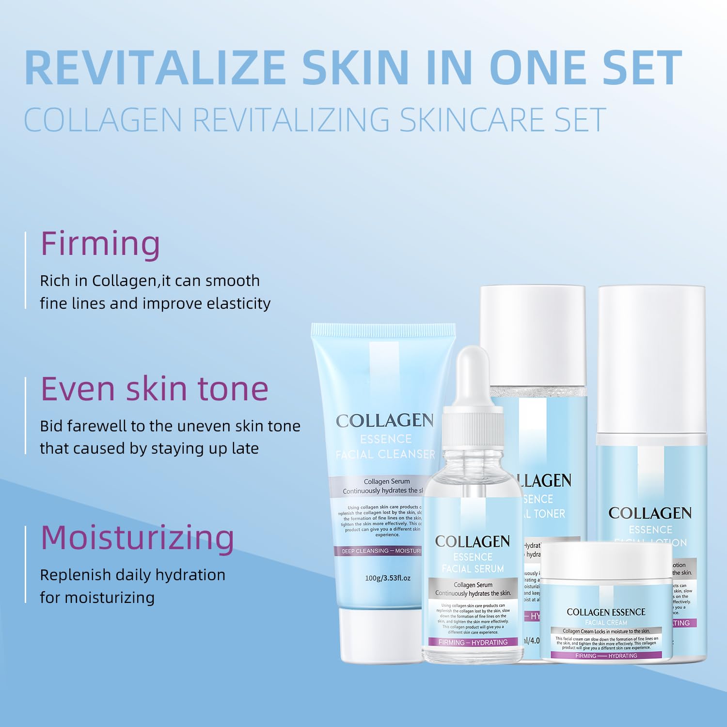 Skin Care Gift Set for Women : This 5-piece collagen skincare set includes all the essentials for your daily routine: Facial Cleanser (100g), Facial Serum (30ml), Facial Toner (120ml), Facial Lotion (100ml), and Facial Cream (50g). Ideal for promoting hydrated, soft, and healthy-looking skin, this skincare kit is designed to support your natural beauty.