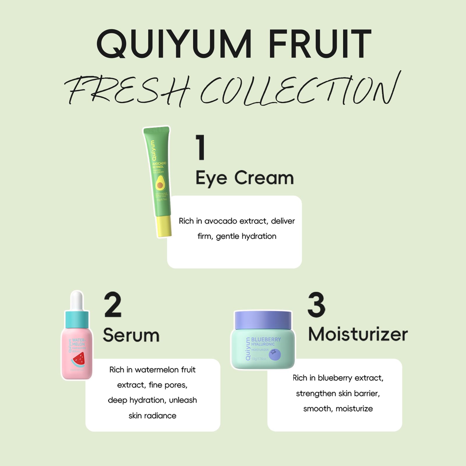 🍉Easier 3-Step Skincare Routine - Discover your new skincare essentials with the QUIYUM Care Skincare Set. This 3-in-1 set includes Watermelon Serum 1.01 fl oz, Avocado Eye Cream 0.71oz and Blueberry Moisturizing Face Cream 1.76 oz. Perfect for beginners and those who want to update their daily skincare routine, this set provides a simple daily care solution.