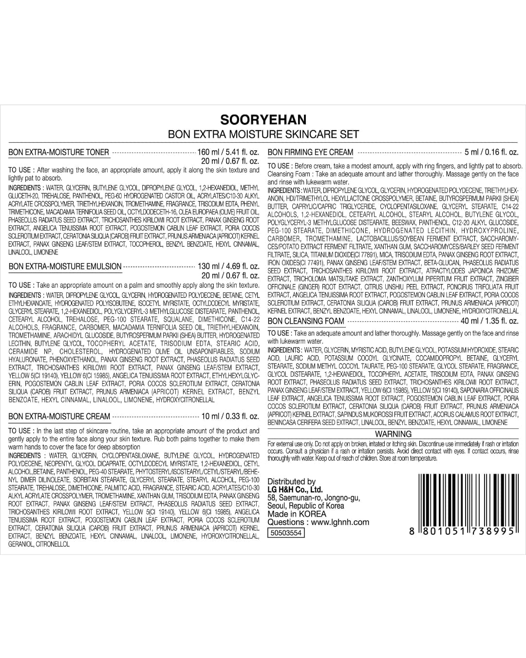 Sooryehan Bon Extra Moisture Korean Skin Care Gift Set (13.01 Fl Oz) - Luxury Premium High-end by LG Beauty. Hydrating Toner, Emulsion Lotion, Cleansing Foam, Eye Cream.