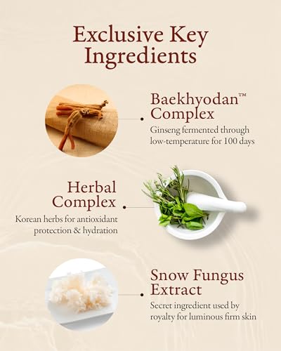 KEY INGREDIENTS – The formula features Baekhyodan, a proprietary herbal blend fermented in traditional earthenware using wild ginseng from Jirisan Mountain and mulberry-derived Lactobacillus. This advanced herbal concentrate boosts skin vitality and moisture retention. Silver Mushroom extract, known for its powerful hydration capabilities, works to soften and smooth rough, dry skin while restoring natural glow and elasticity.