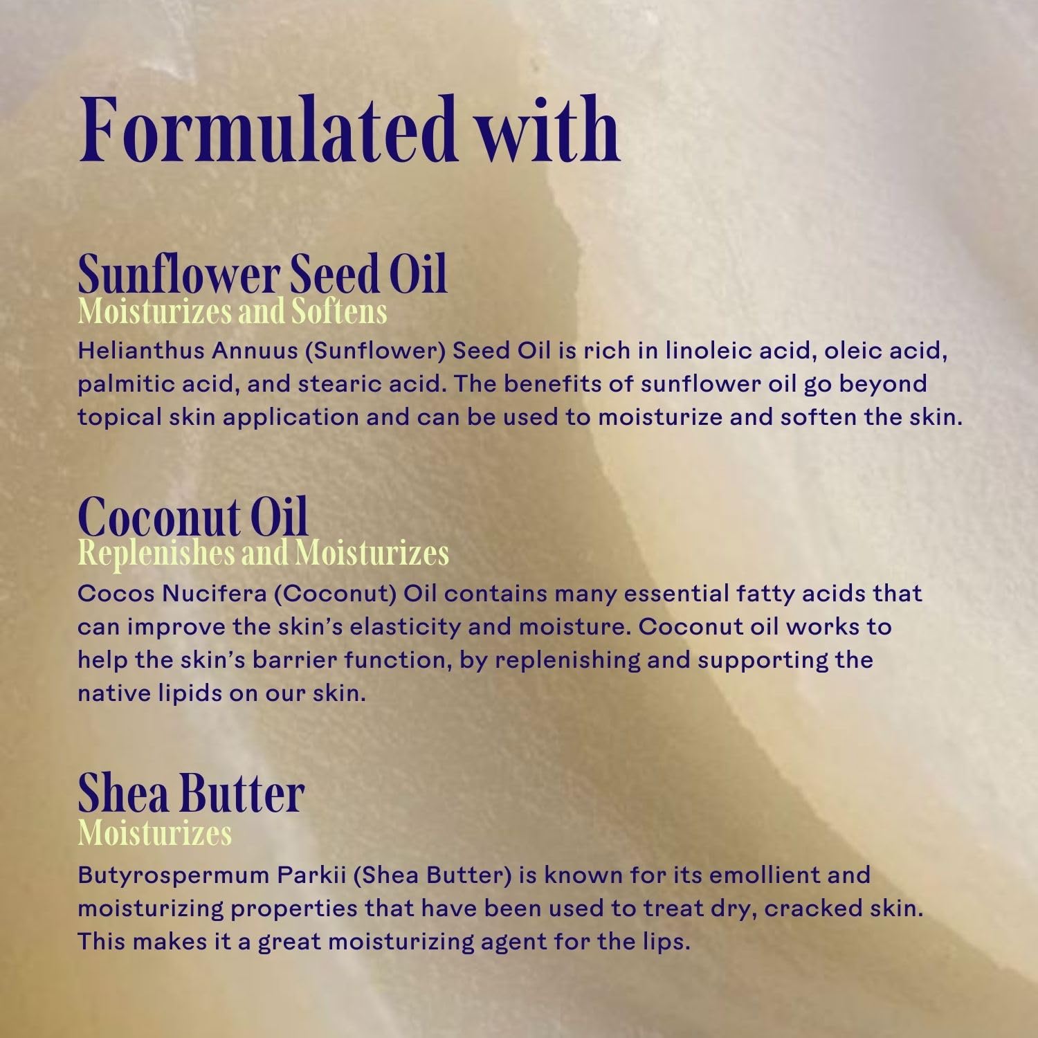 BUTTERCREAM LIP MASK: Offering soothing relief and protection for damaged lips, this everyday Shea Butter lip balm leaves skin smooth, soft and supple. The rich formula is intensely moisturizing and revitalizing on chapped and peeling lips.