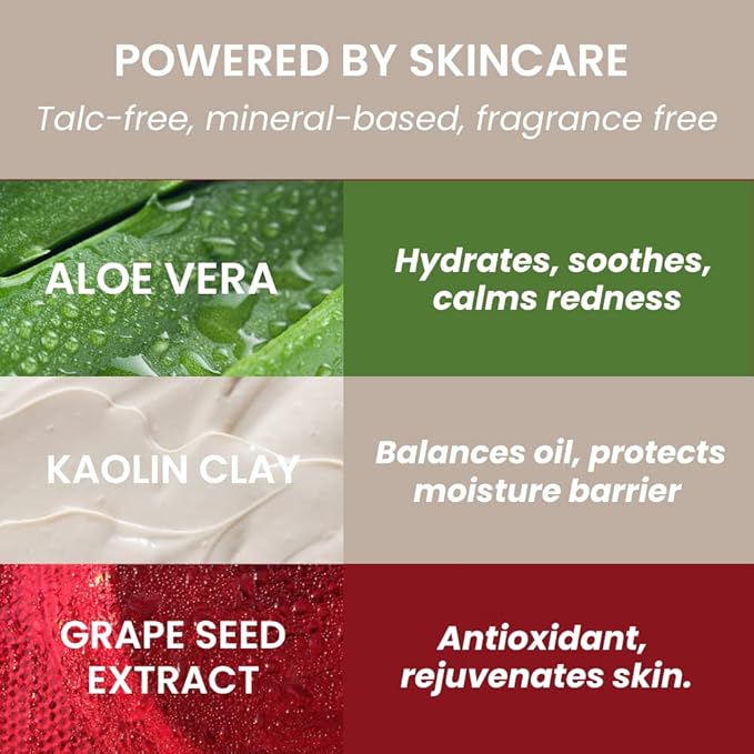 • Packed with Natural Skincare Ingredients: Ideal for all skin types, this featherweight powder features botanical extracts like skin-soothing Aloe Vera, rejuvenating Grape extract, and oil-balancing Kaolin Clay
