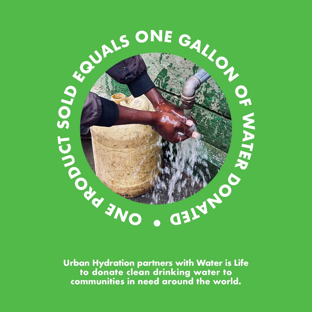 ABOUT US: Urban Hydration values community and giving back. With our collective efforts, we aim to be a force for global good. For every product sold, 1 gallon of water is donated, enabling communities without access to clean drinking water to Urban Hydration's clean water donations. Be part of the global impact and movement