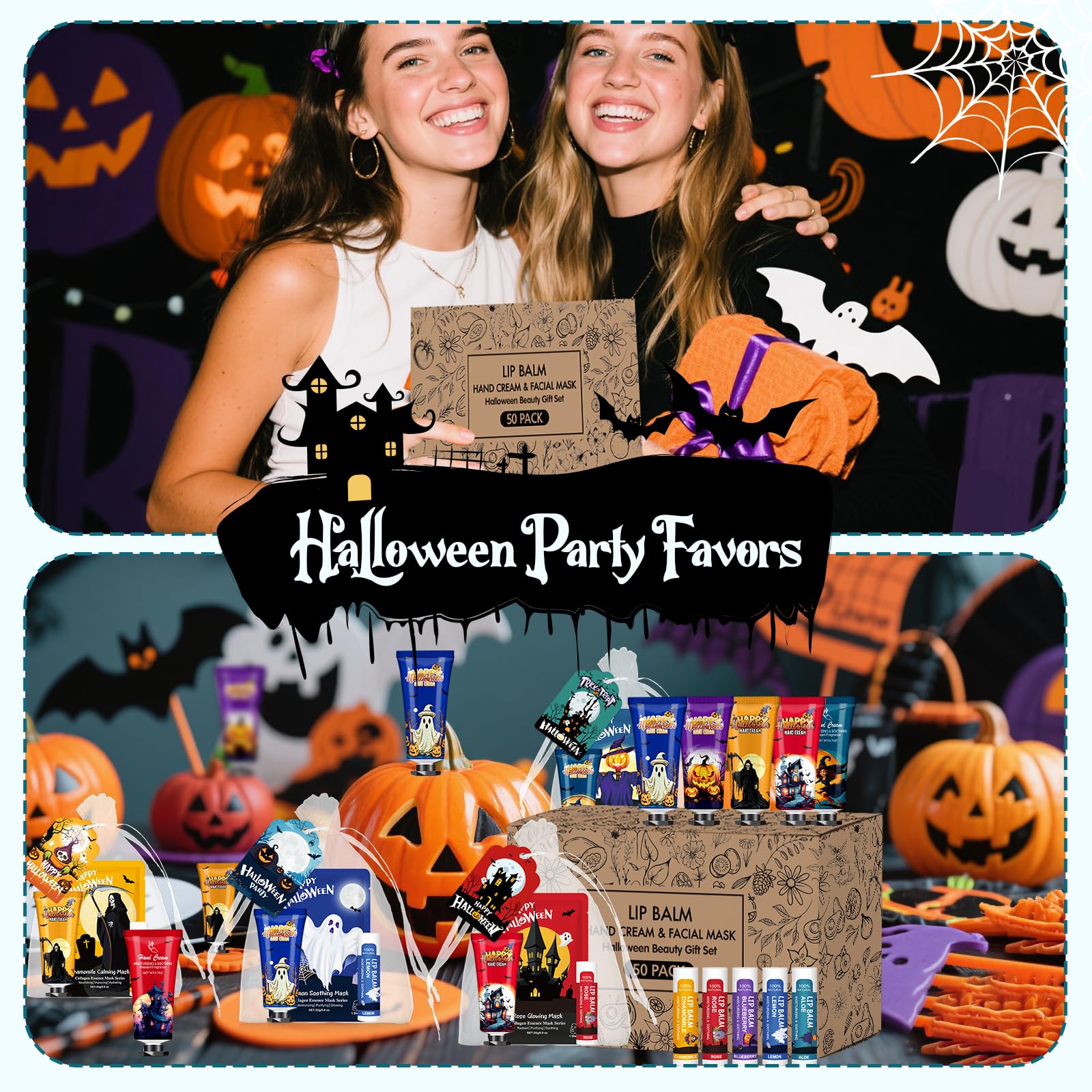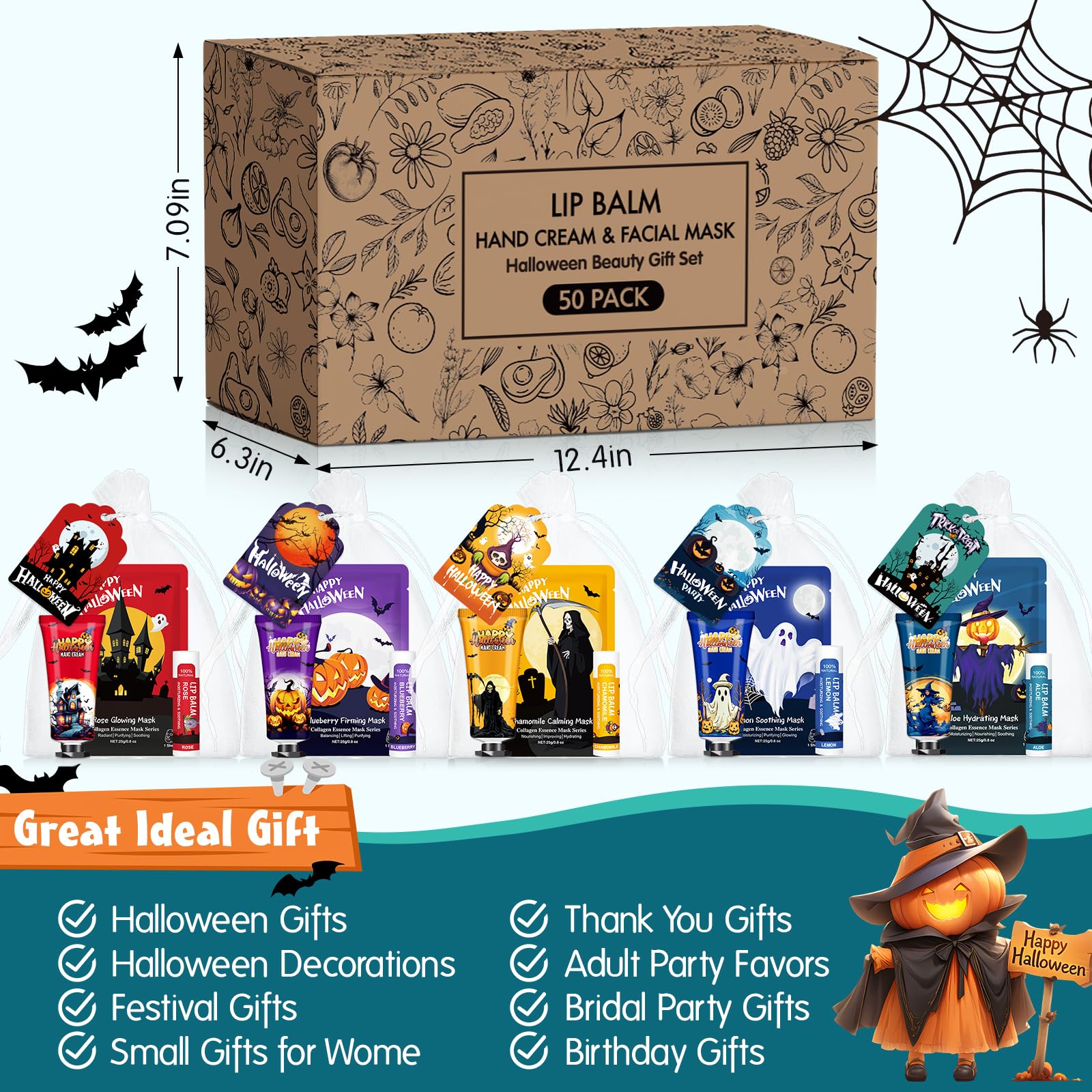 【50 Pack Halloween Gifts Kit】This Halloween skincare gifts set includes 50pcs hand creams,50pcs face masks,50pcs lip balms,50pcs organza gift bags,50pcs Halloween cards and 1pcs operation manual.It comes with everything you need,is easy to assemble and carry,and its cute Halloween patterns enhance the atmosphere and sense of mystery at Halloween party